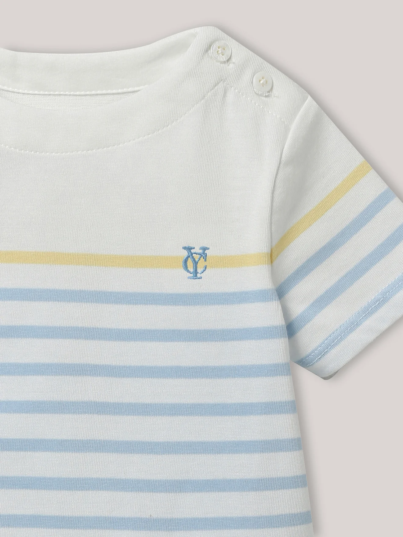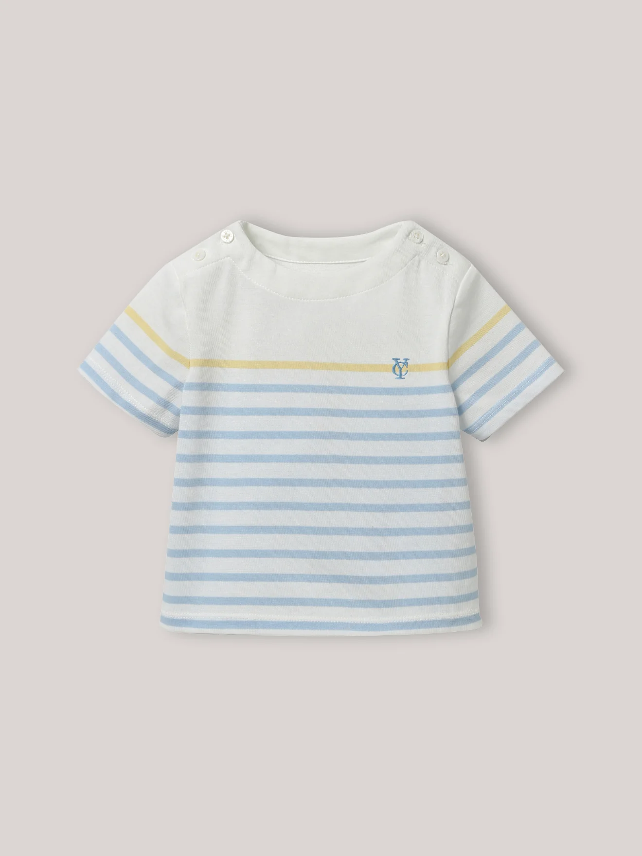 Une pièce iconique de nos collections, reconnaissable par sa rayure bleue et soulignée ici par une bande coloris citron qui l’illumine. Encolure bateau Ouverture par boutons sur les épaules Monogramme brodé sur la poitrine