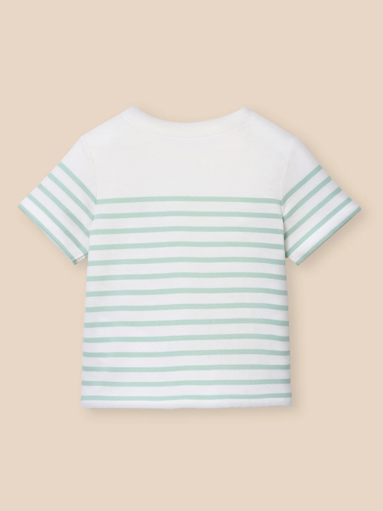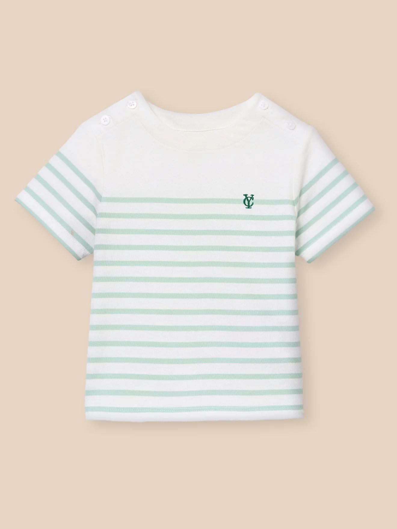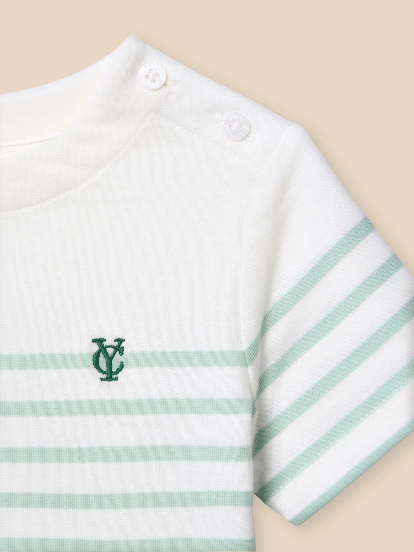 Une pièce iconique de nos collections, reconnaissable par sa rayure bleue et soulignée ici par une bande coloris citron qui l’illumine. Encolure bateau Ouverture par boutons sur les épaules Monogramme brodé sur la poitrine