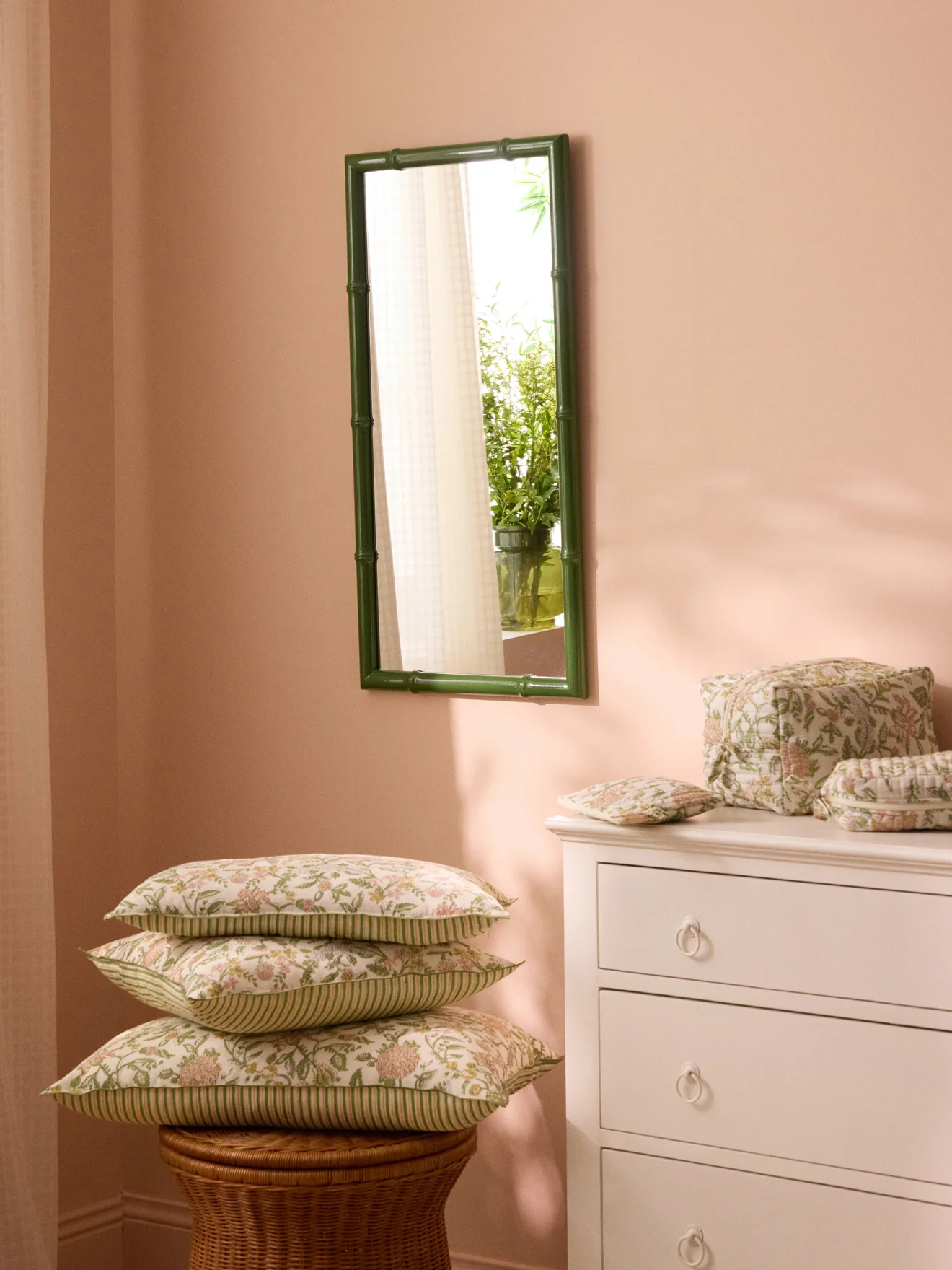 Miroir en bois sculpté et peint, façon tiges de bambou. Grand miroir rectangulaire à positionner horizontalement ou verticalement pour agrandir une pièce ou lui apporter plus de clarté.