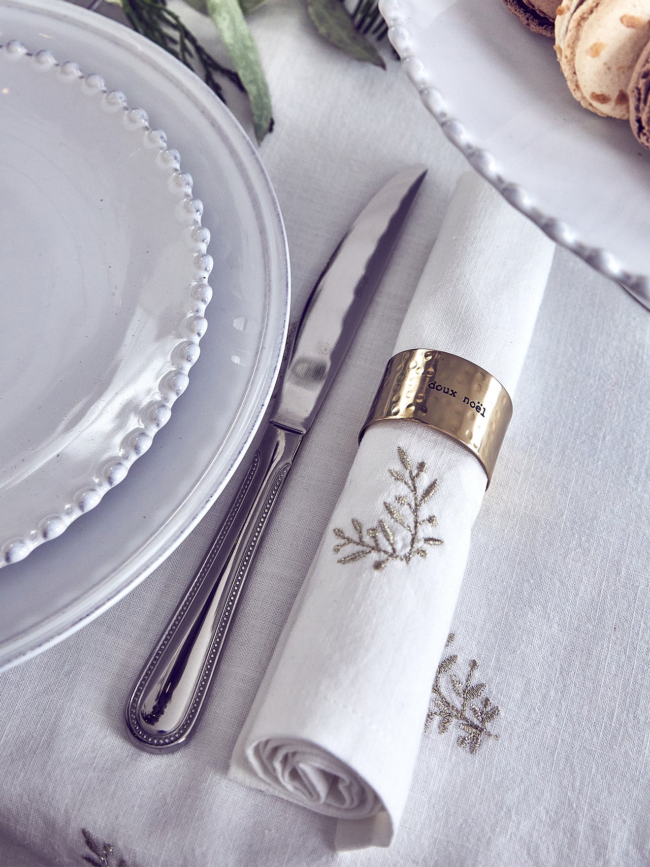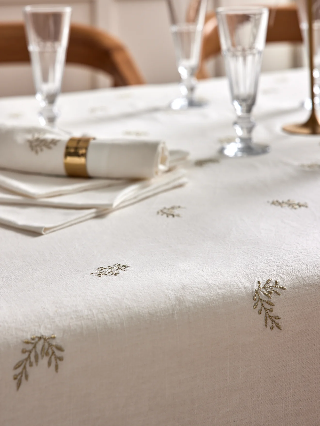 Nappe en coton et viscose brodée de brindilles et petites baies en fil doré.