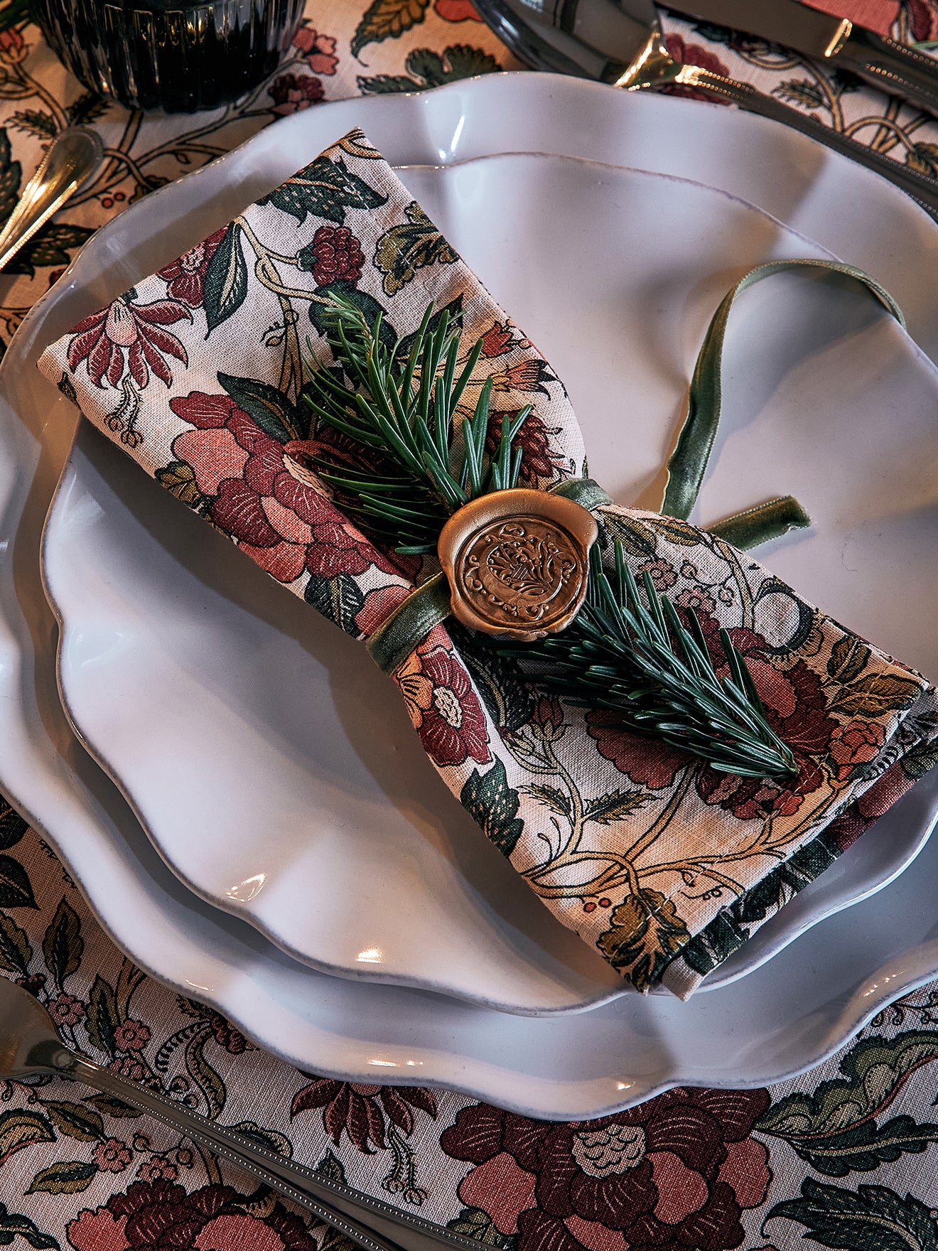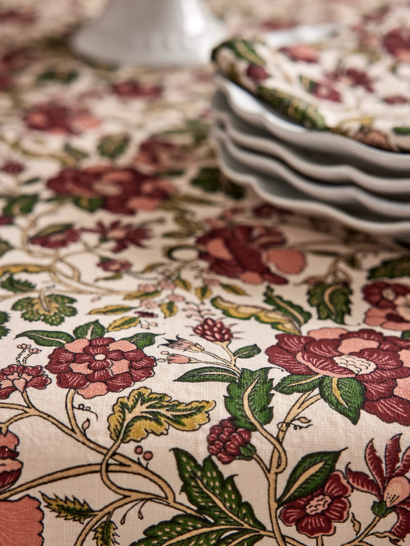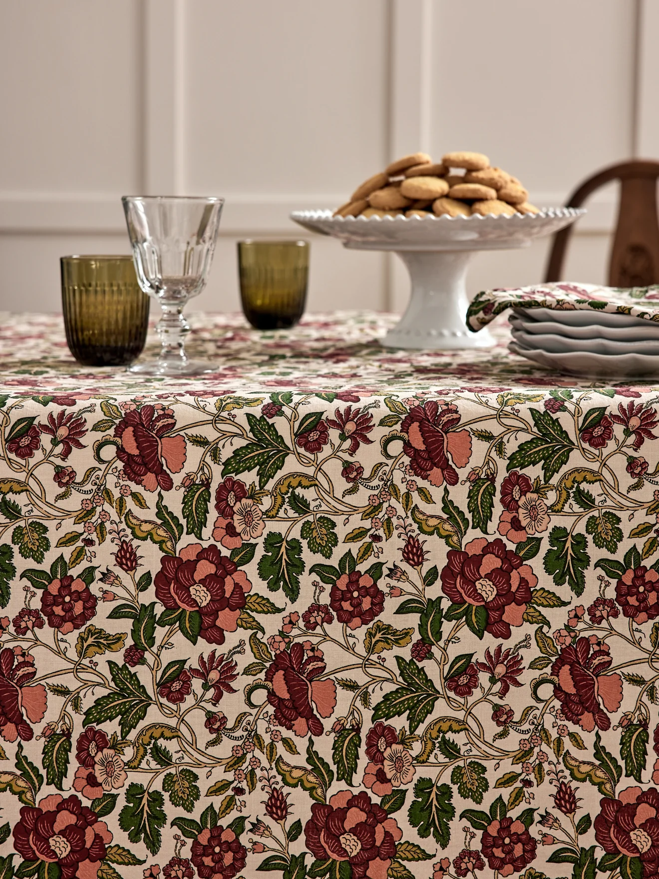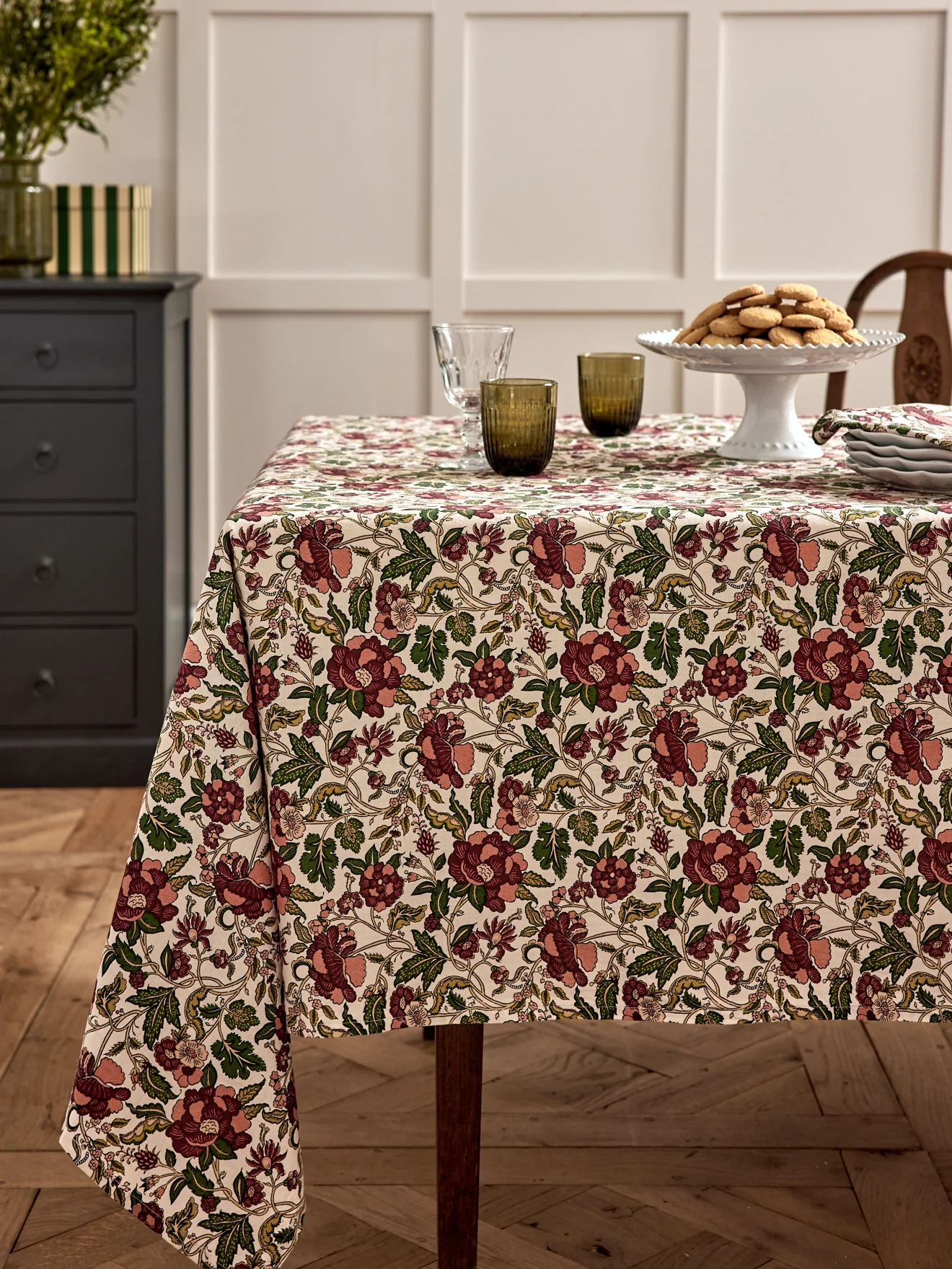 Nappe imprimé fleuri aux couleurs de Noël, intenses et chaleureuses.