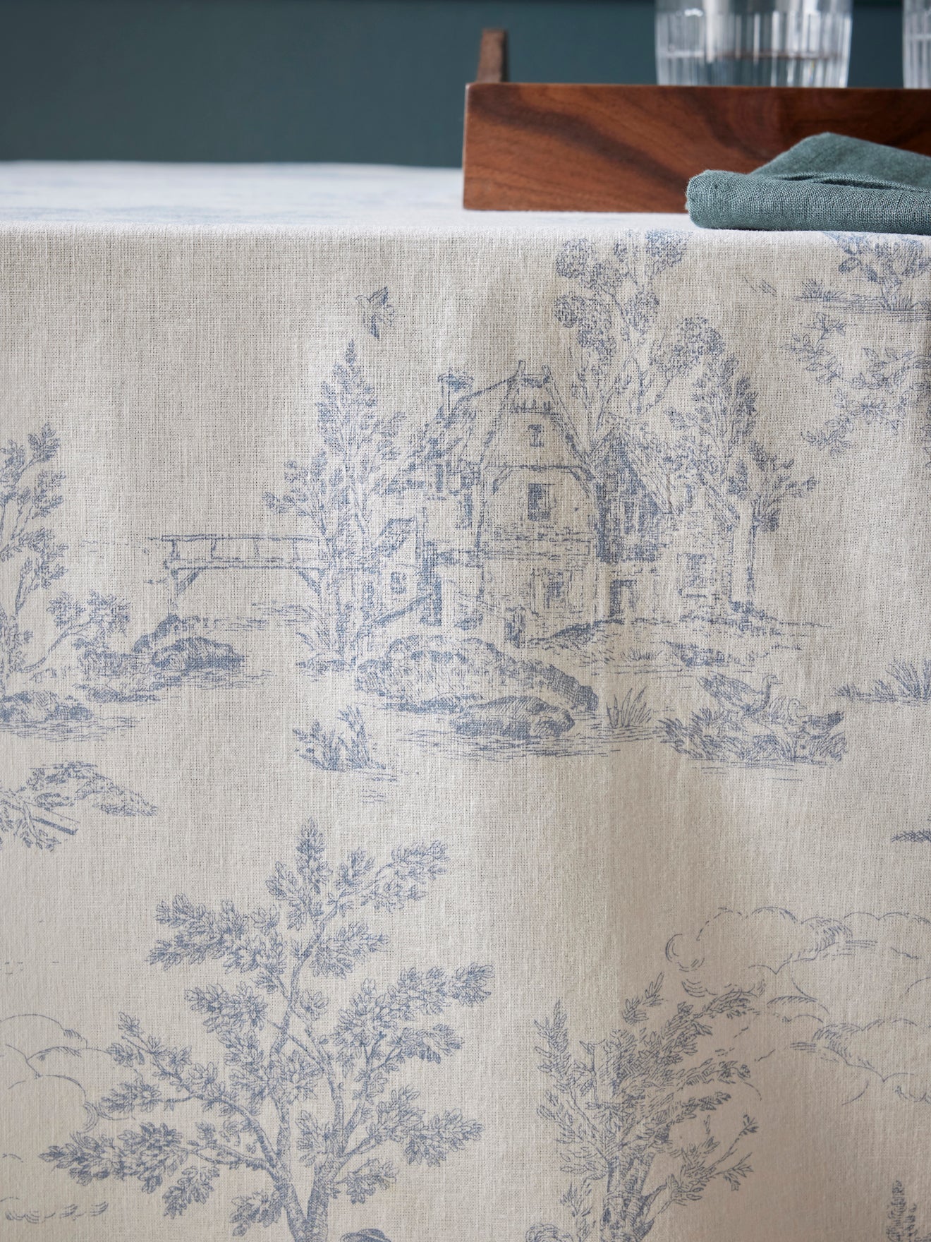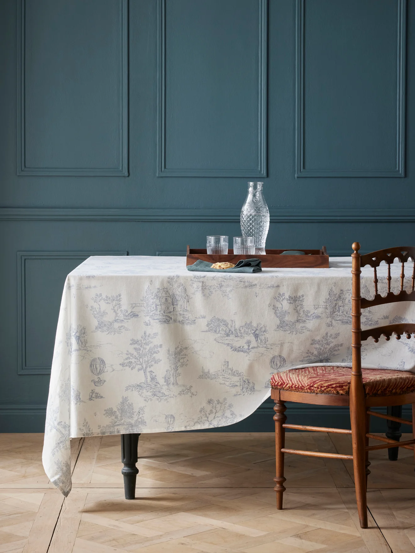 Nappe inspirée de la célèbre Toile de Jouy. Un style authentique à l’aspect délicatement texturé. Le coton tramé associe le confort du coton (91%) avec une touche de viscose (9%) pour plus de souplesse. Le parfait équilibre entre bien-être et élégance.