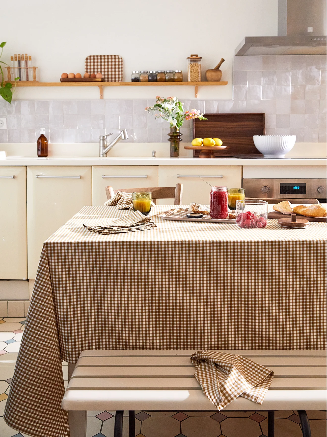 Nappe imprimée de petits carreaux coloris caramel pour réinventer l’intemporel vichy avec justesse et modernité. Confectionnée en percale de coton lavée, elle est souple et très agréable au toucher.