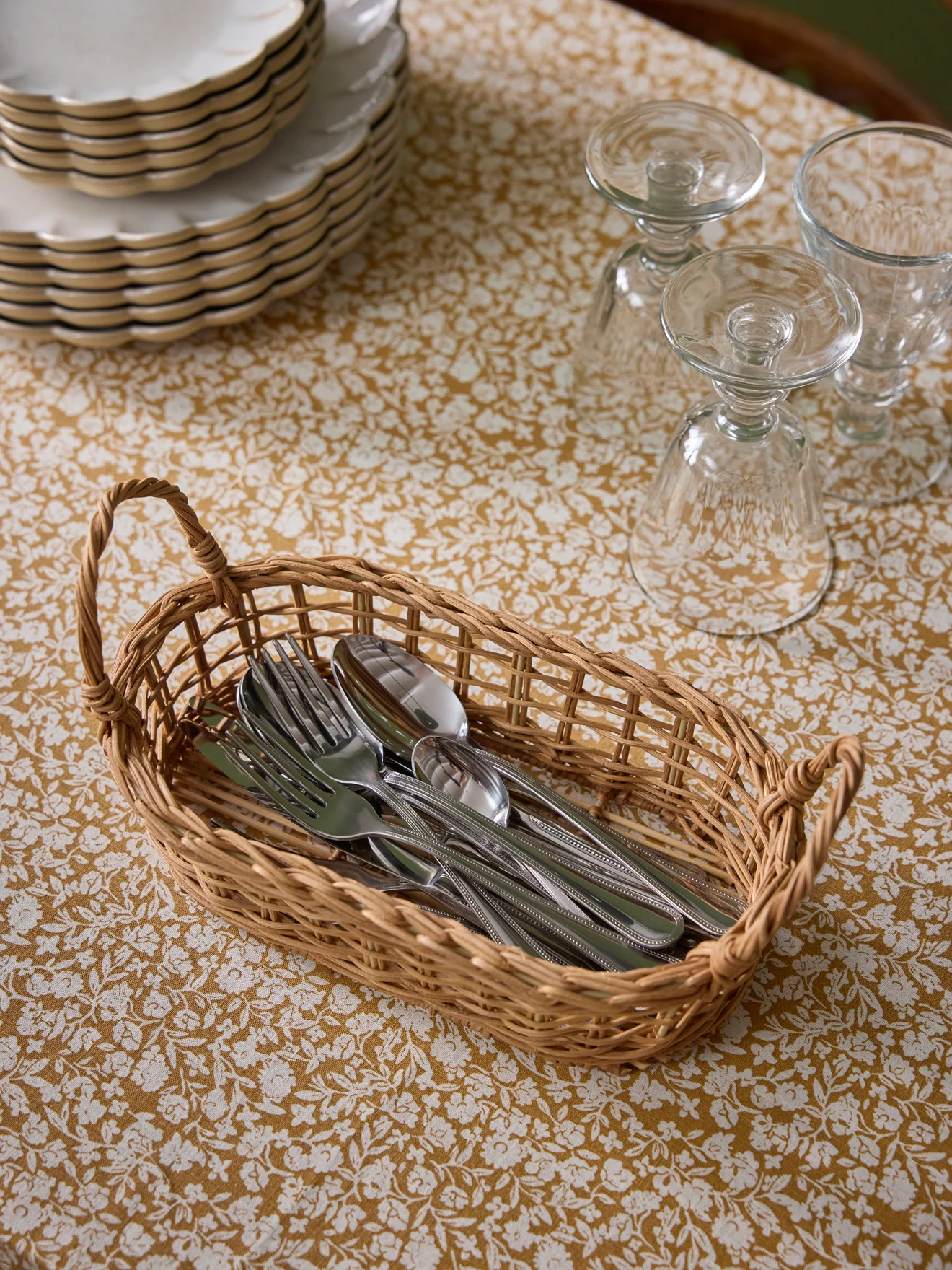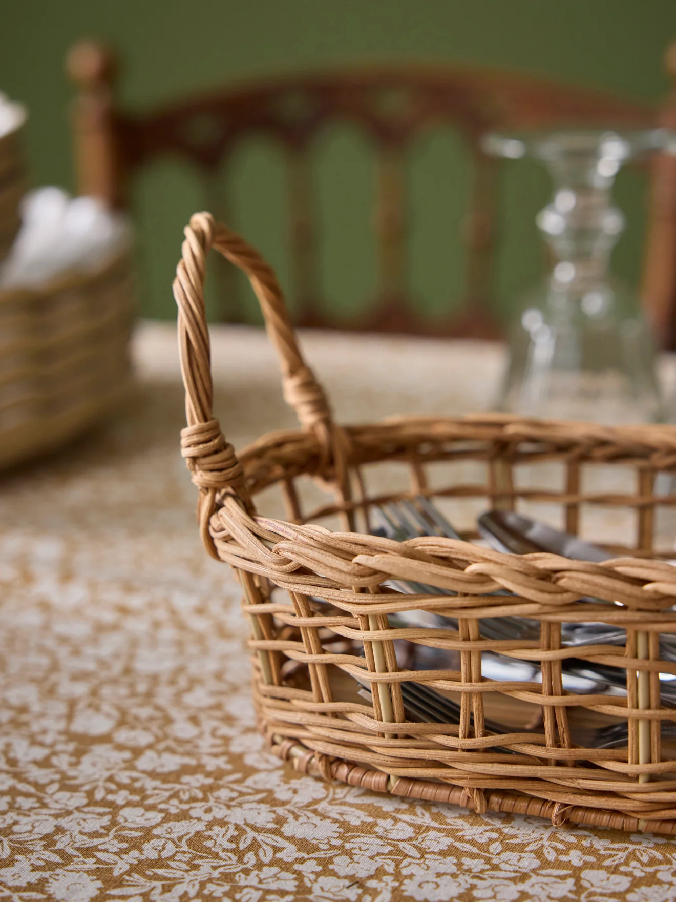 Panier de table en rotin tressé aspect vintage. Avec 2 anses. Pratique pour disposer des couverts de manière naturelle et élégante.