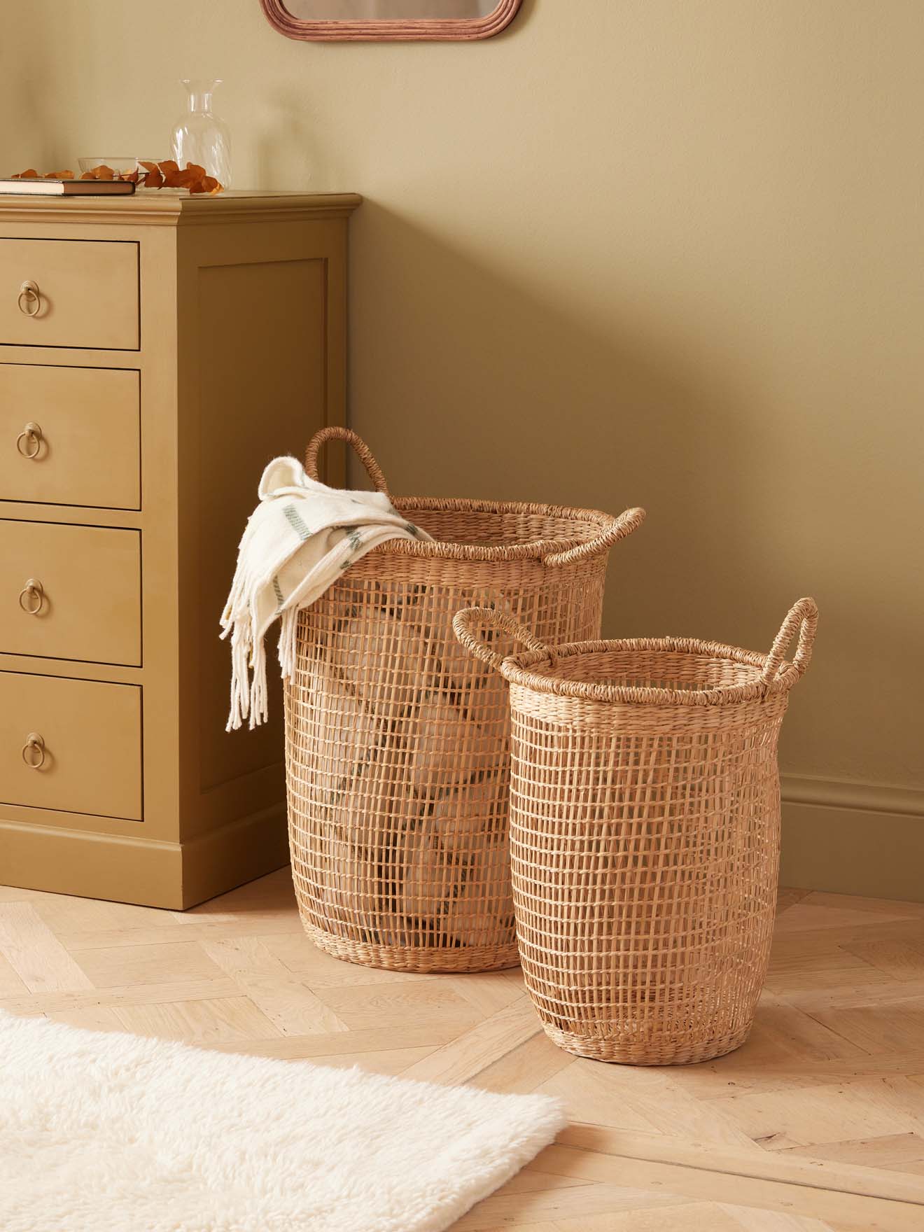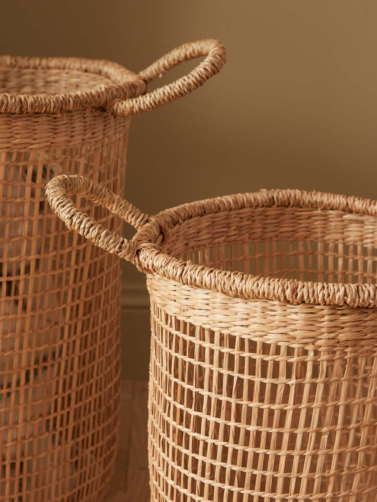 Paniers à linge ou paniers de rangement en jonc de mer naturel tissés à la main. Les possibles irrégularités soulignent l’authenticité et la singularité de ces paniers. Lot comprenant 2 paniers de tailles différentes :
