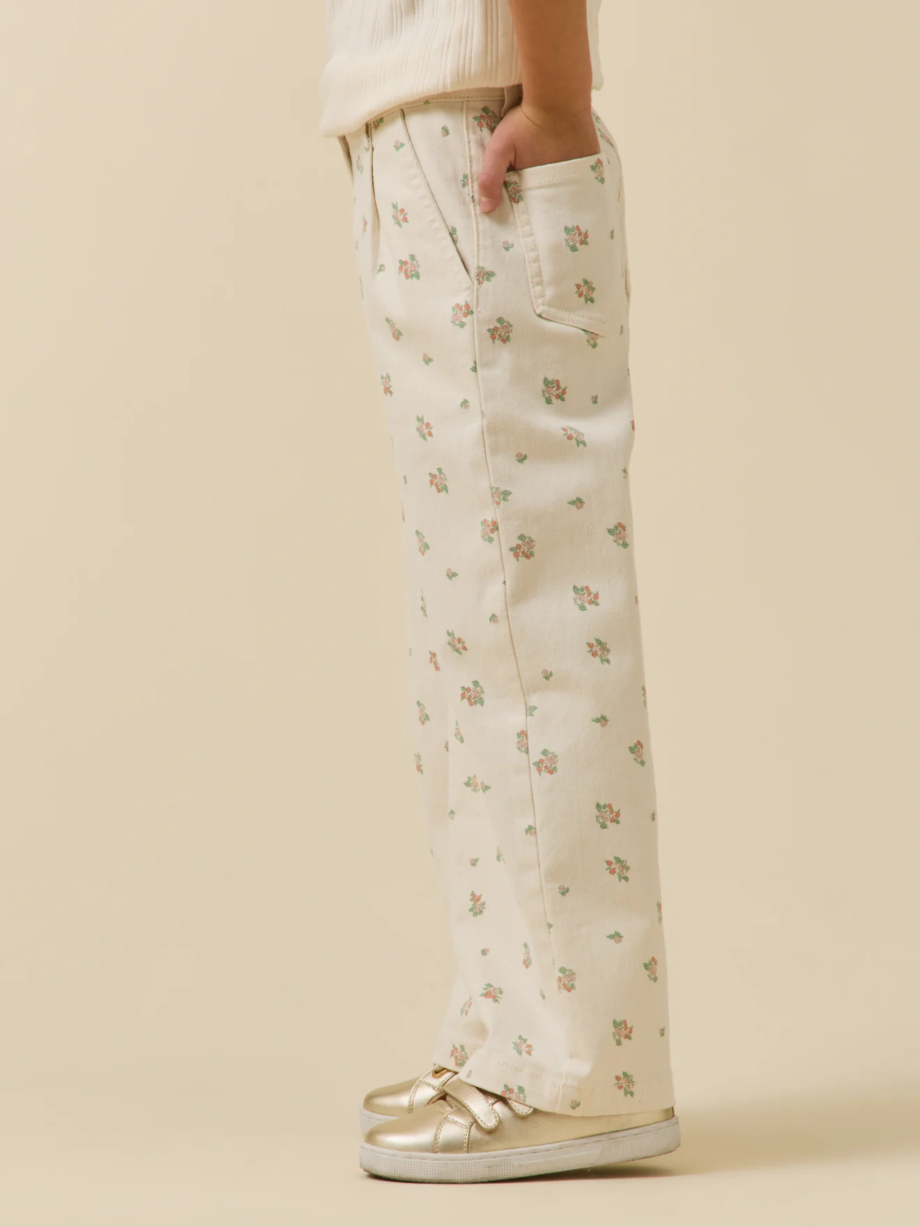 Pantalon large avec un imprimé frais et délicat. Fermeture par bouton et glissière. Pour un habillage facile, nos pantalons ont un bouton-pression jusqu’à la taille 10 ans. Taille ajustable de l’intérieur par élastique boutonné. Passants sur la ceinture. 2 poches devant