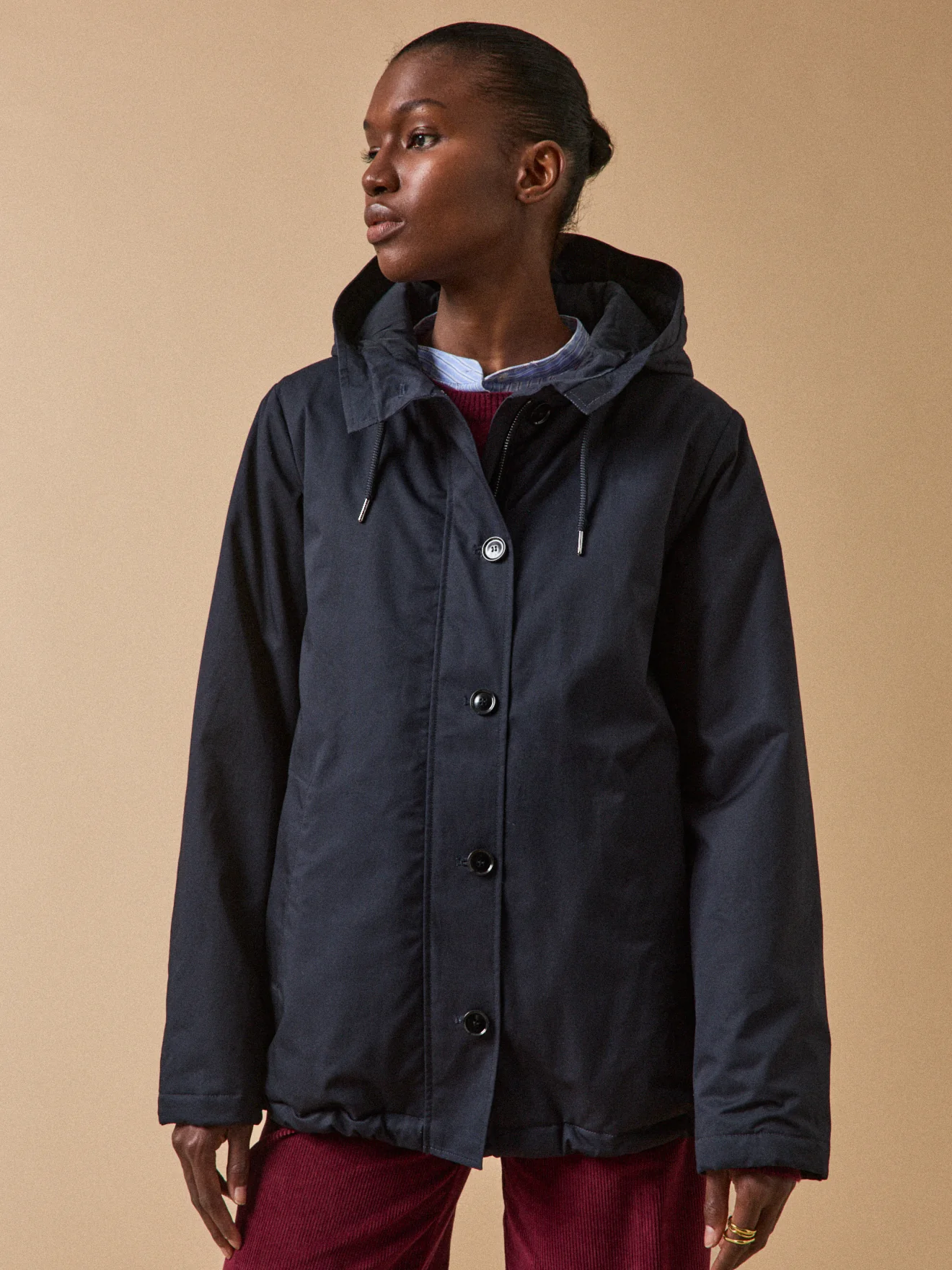 - Col montant boutonné, capuche enveloppante resserrable par cordon ; long. dos 73 cm (en taille M)