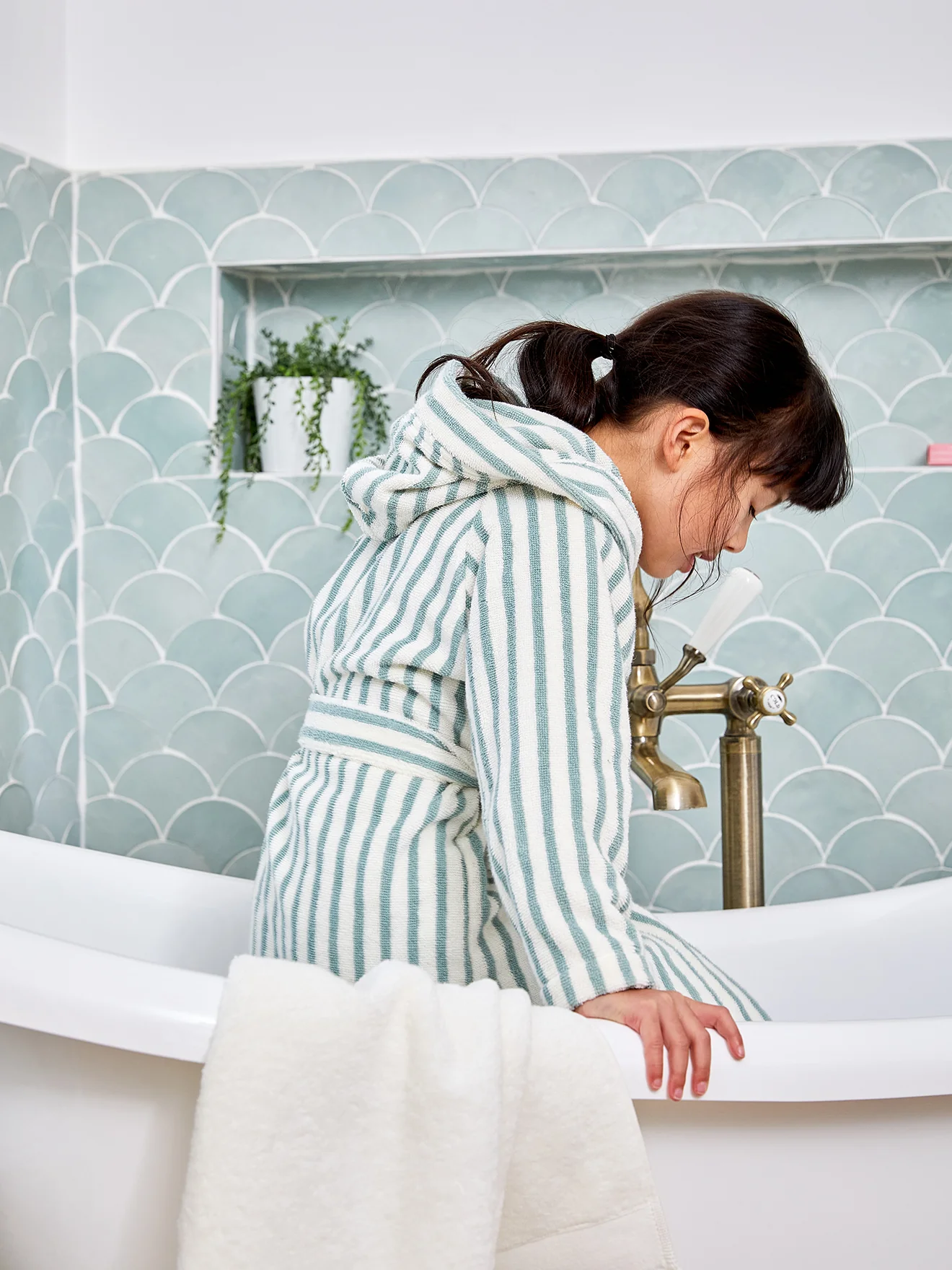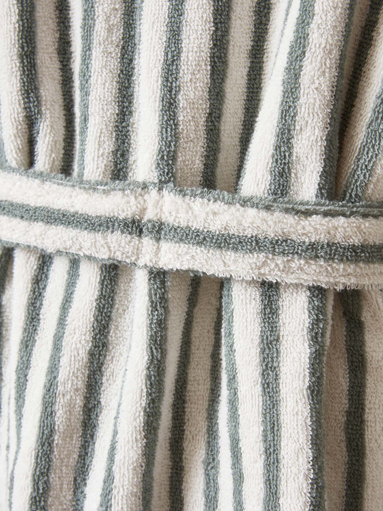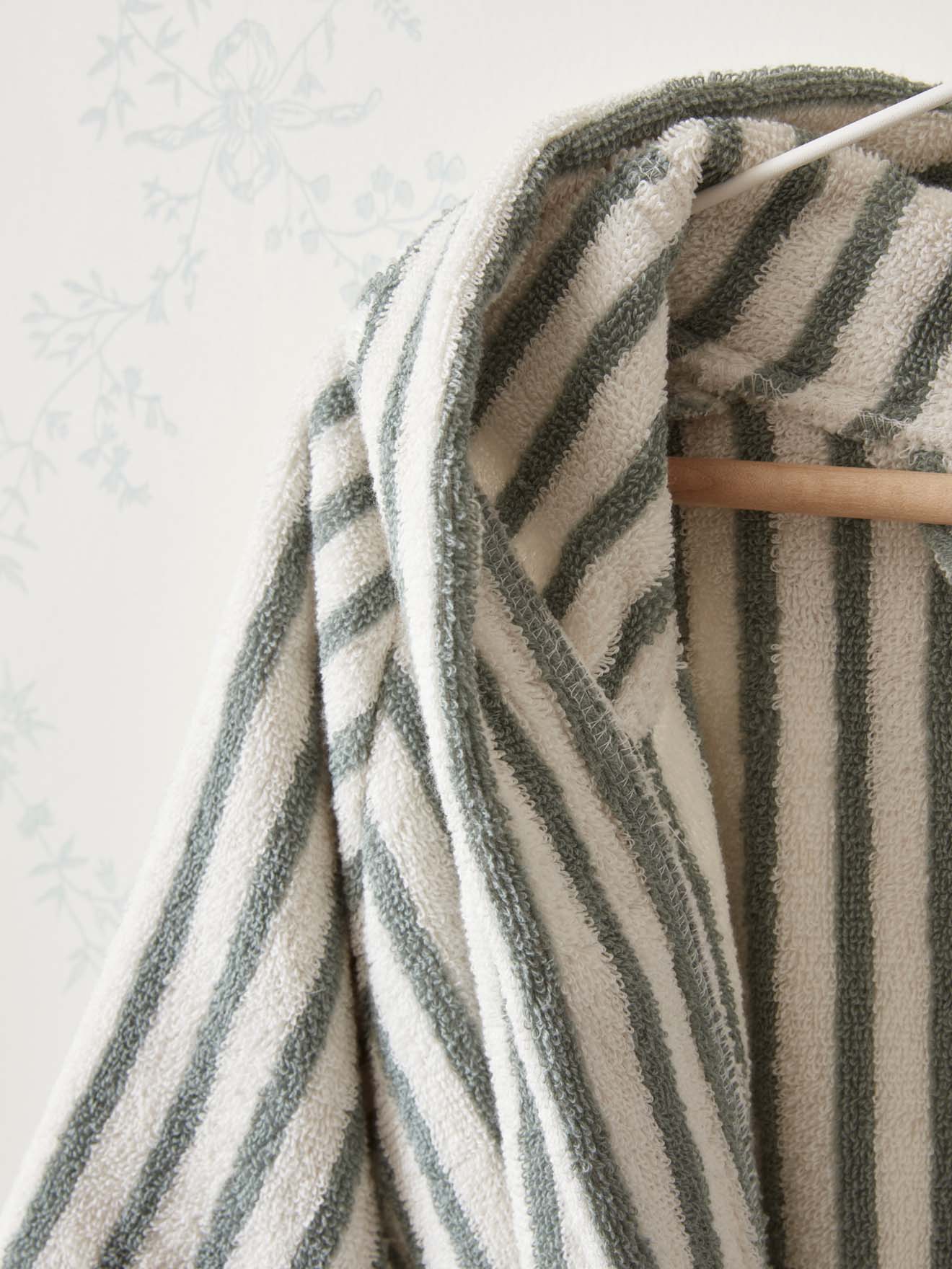Peignoir à capuche confectionné au Portugal dans une belle éponge absorbante. Les fils teints assurent une tenue parfaite des rayures lavage après lavage.