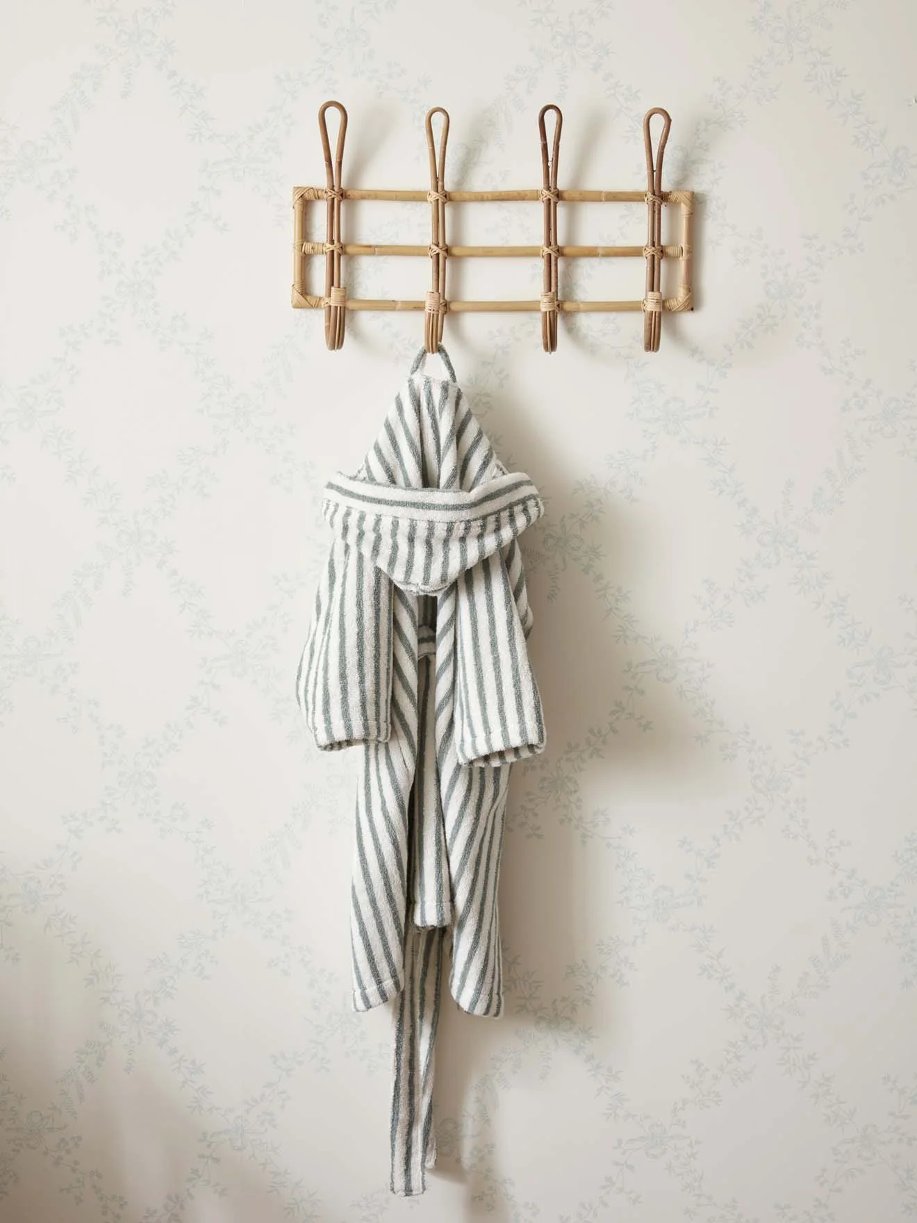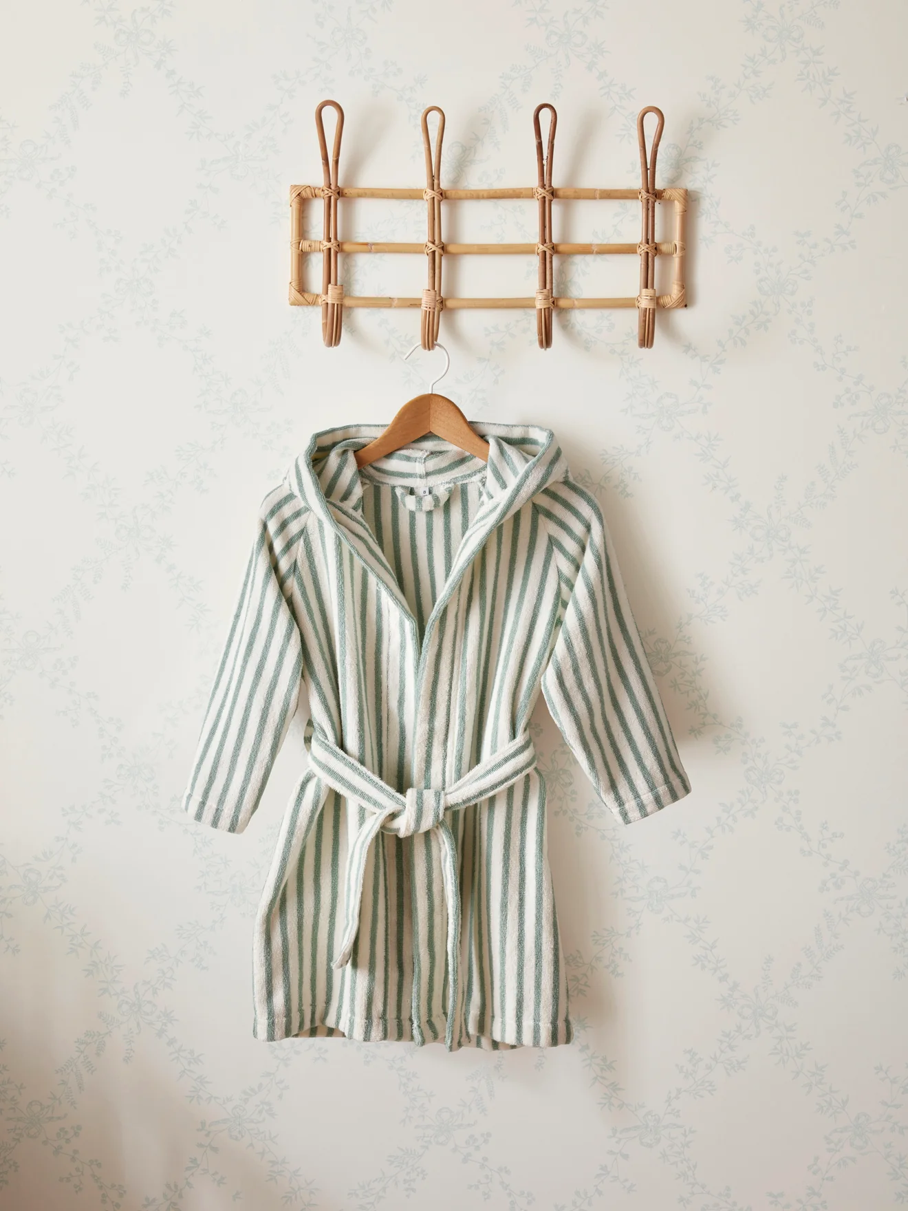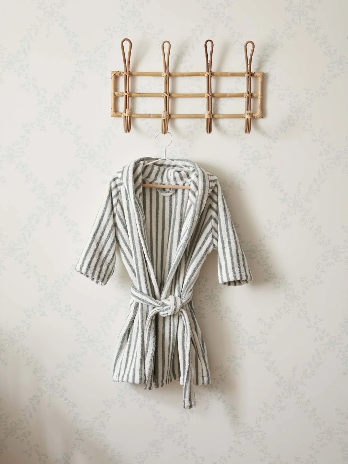 Peignoir à capuche confectionné au Portugal dans une belle éponge absorbante. Les fils teints assurent une tenue parfaite des rayures lavage après lavage. Manche raglan Ceinture sous passants cousue au dos (+ boutons pression pour les tailles 4 et 6 ans).