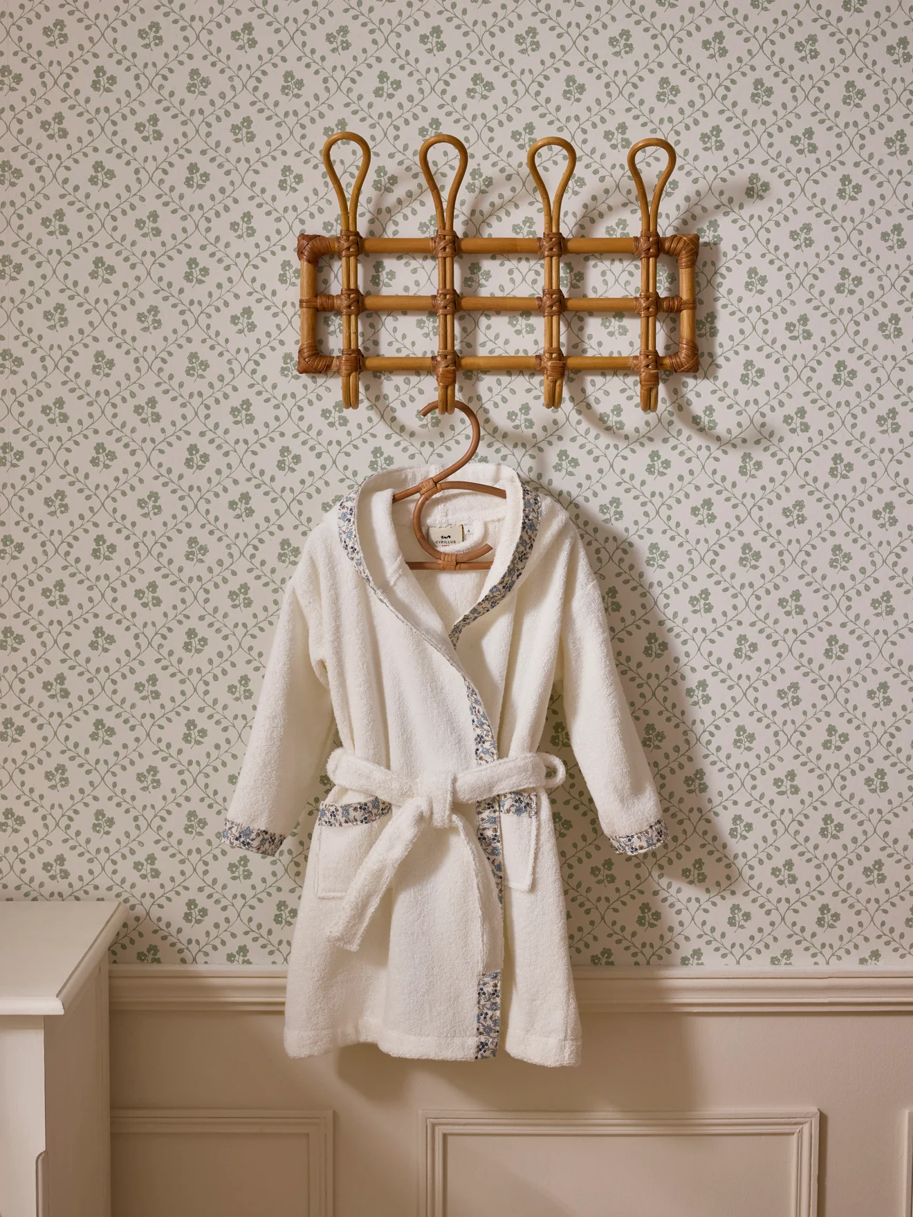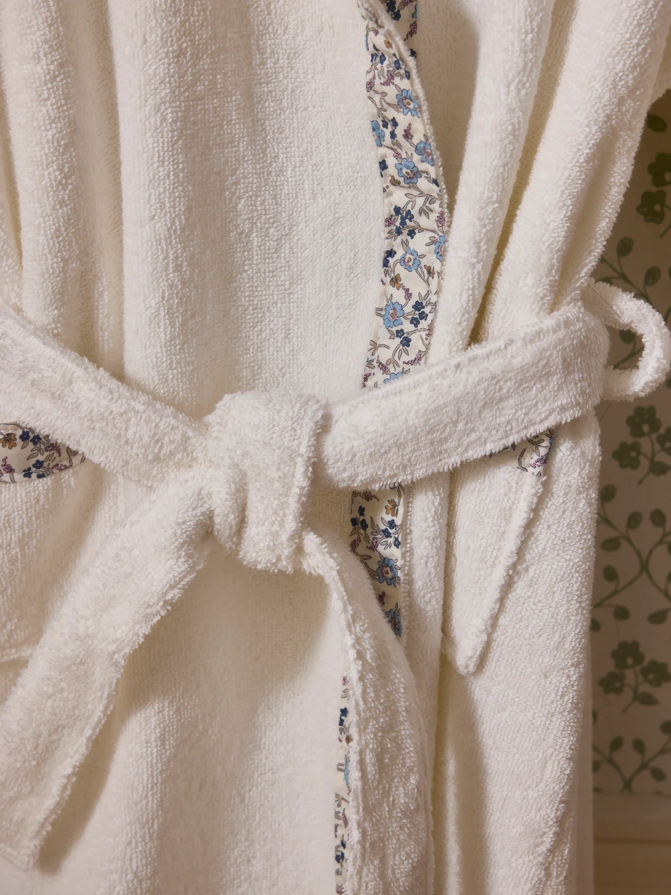 Peignoir en coton absorbant rehaussé de détails en tissu Liberty. Une pièce douce et raffinée confectionnée au Portugal.