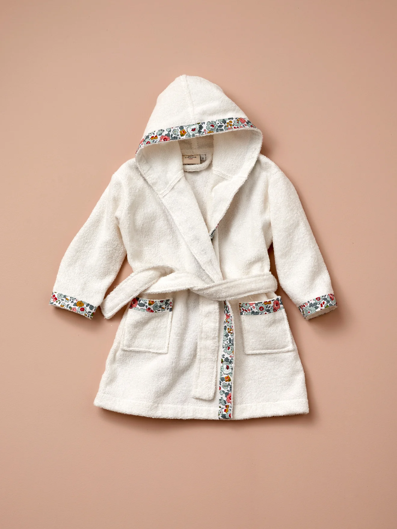 Peignoir en coton absorbant rehaussé de détails en tissu Liberty. Une pièce douce et raffinée confectionnée au Portugal. 2 poches plaquées. Capuche. Ceinture à nouer sous passants.