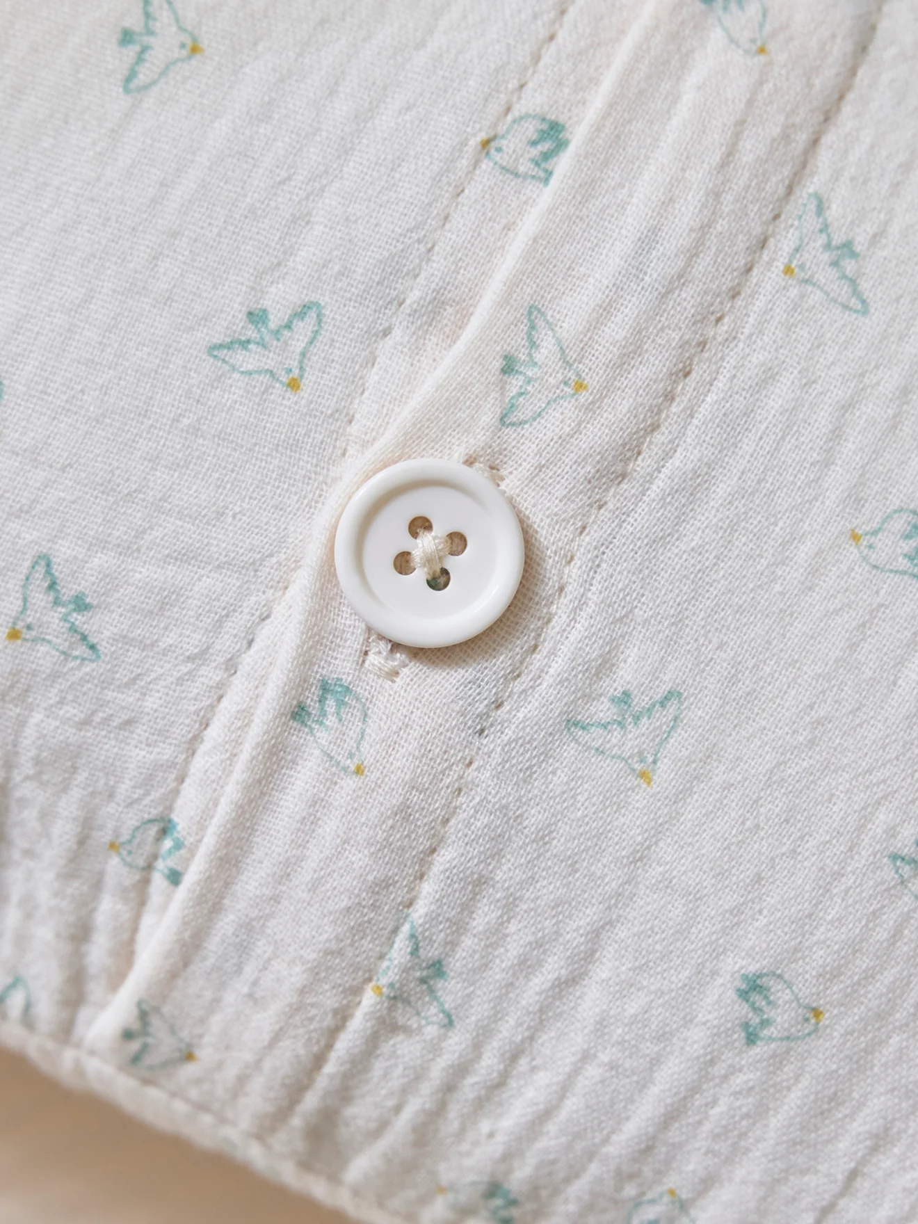 Imprimés exclusifs et broderie « doux rêves » en fil doré. La tendresse se pose sur ce coussin déhoussable aussi mini que mignon.