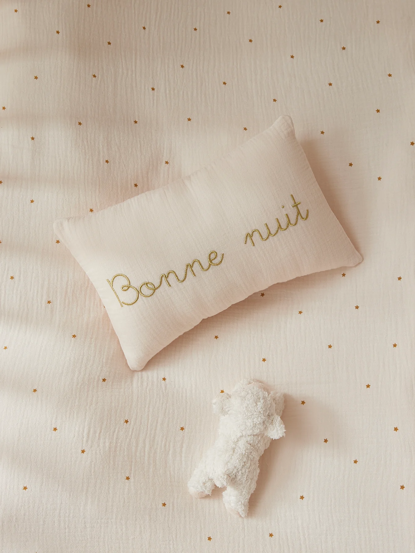 Aussi petit que mignon, le coussin en gaze de coton se brode de petits mots dorés. Reconnaissable par son aspect gaufré, la double gaze est un tissu de coton délicat, doux et aérien.