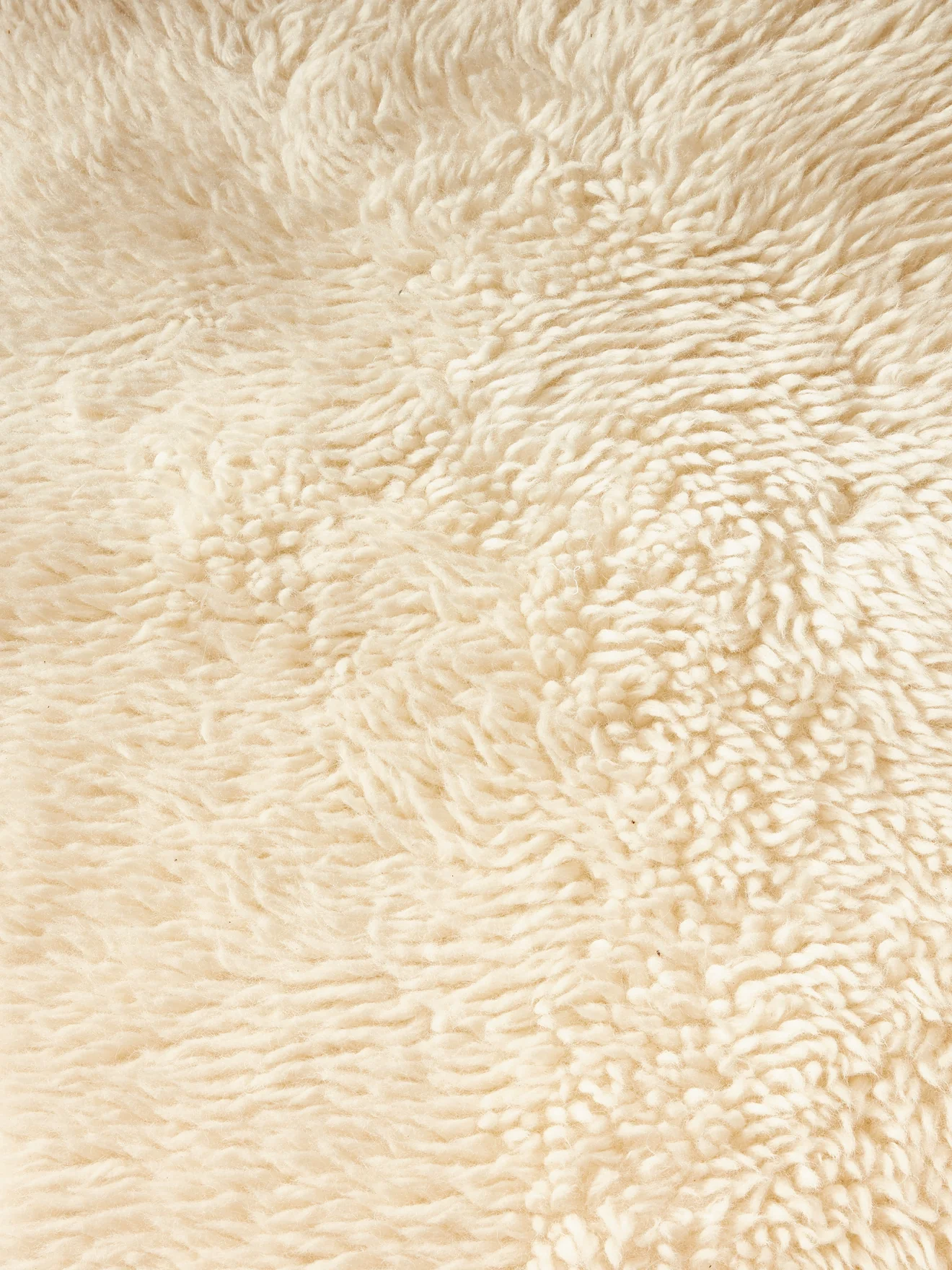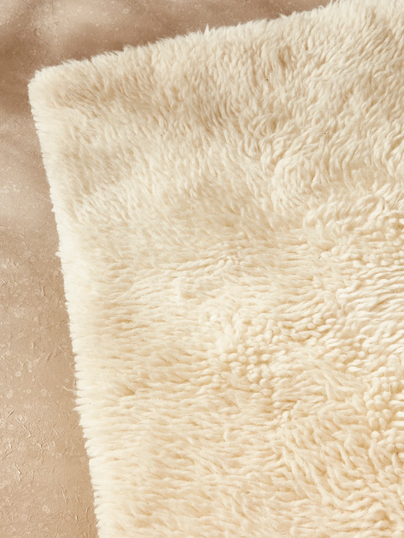 Petit tapis ou descente de lit composé de longs brins de laine coloris ivoire. Sensation réconfortante de douceur et de chaleur.
