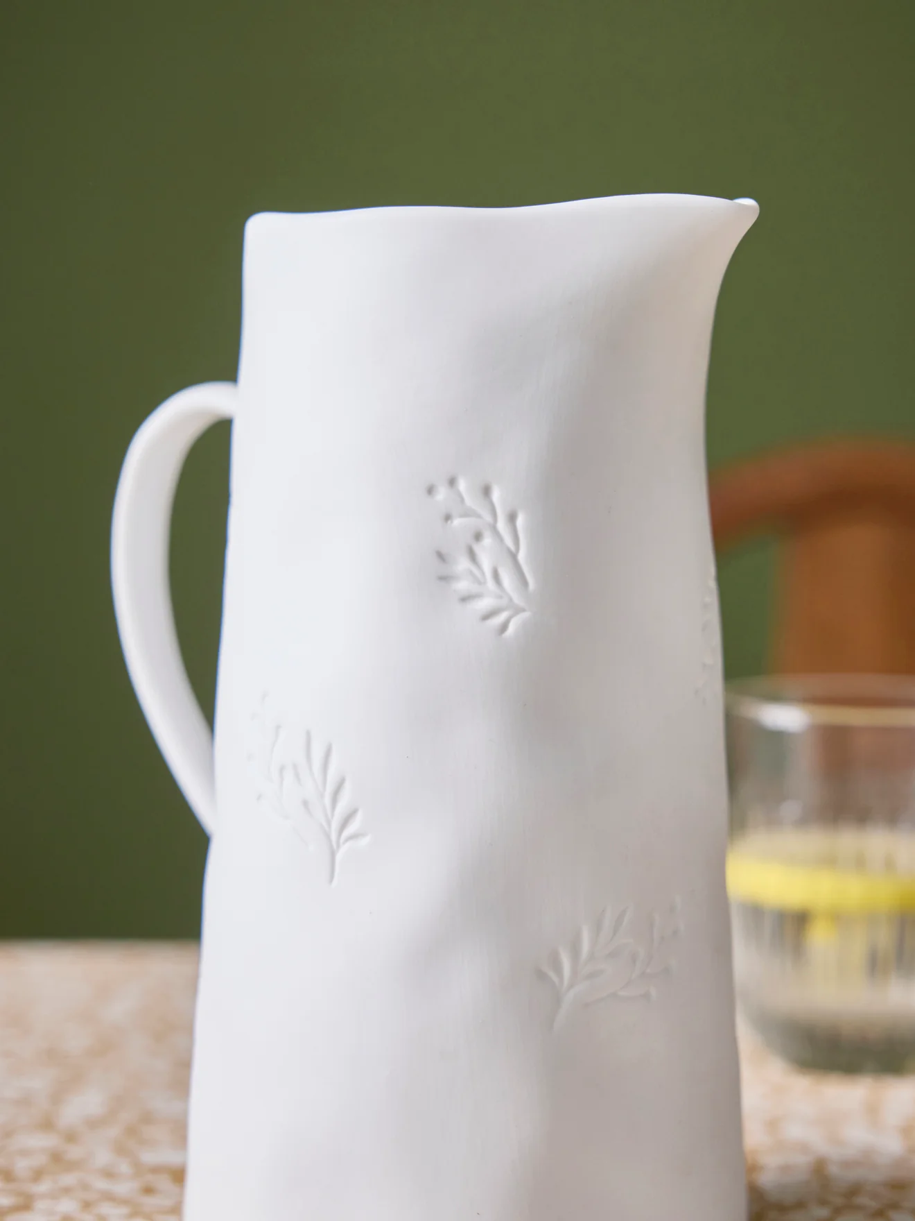 Pichet en biscuit de céramique. Aspect modelé et motifs feuillage embossés. Le biscuit est une faïence cuite sans émaillage, ce qui lui procure son aspect mat. L’intérieur du pichet est émaillé afin de protéger la céramique d’éventuelles colorations. Le pichet feuillage est une création Cyrillus.