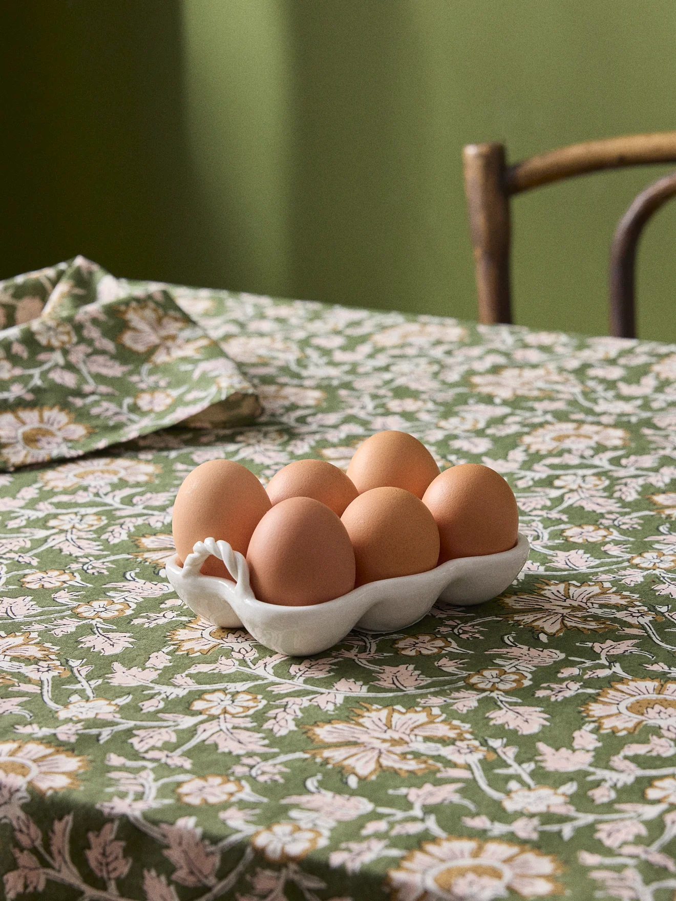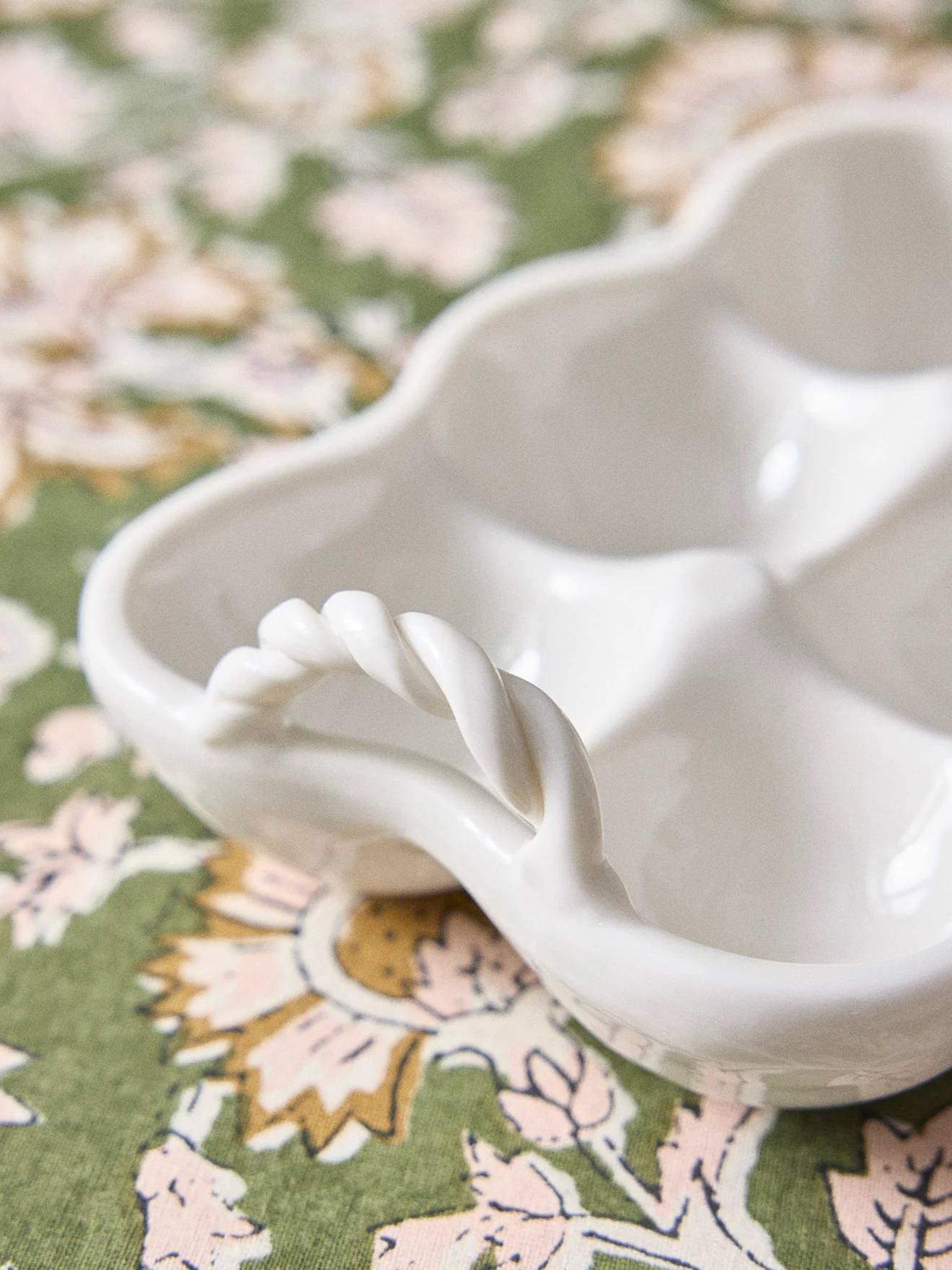 Support à oeufs en céramique avec anses torsadées. Pour ranger les oeufs ou les servir à table de manière chic et esthétique.
