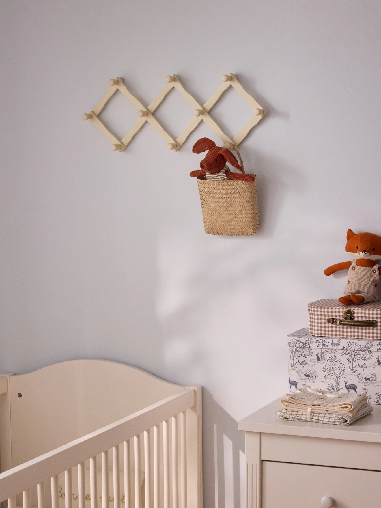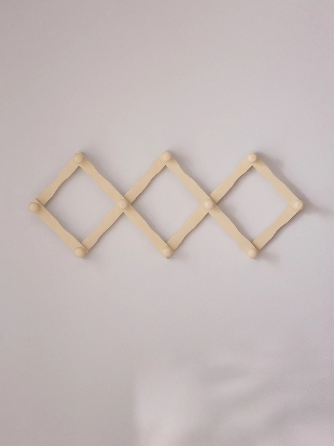 Portemanteau mural en bois peint. Charme, design et authenticité du style brocante. Extensible, il s’étend ou se contracte selon la place et les envies. Il se fixe au mur à l’aide des 2 accroches au dos.