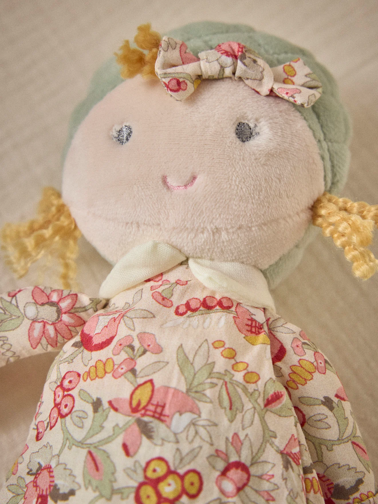 Adorable petite poupée de chiffon en tissu et velours. La robe et le noeud sont confectionnés avec notre imprimé fleuri Mireille. Moelleuse, la poupée Juliette est facile à attraper, à câliner. Yeux et bouche brodés Poupée 22 cm environ Dès la naissance. Jouet conforme aux exigences des normes européennes.