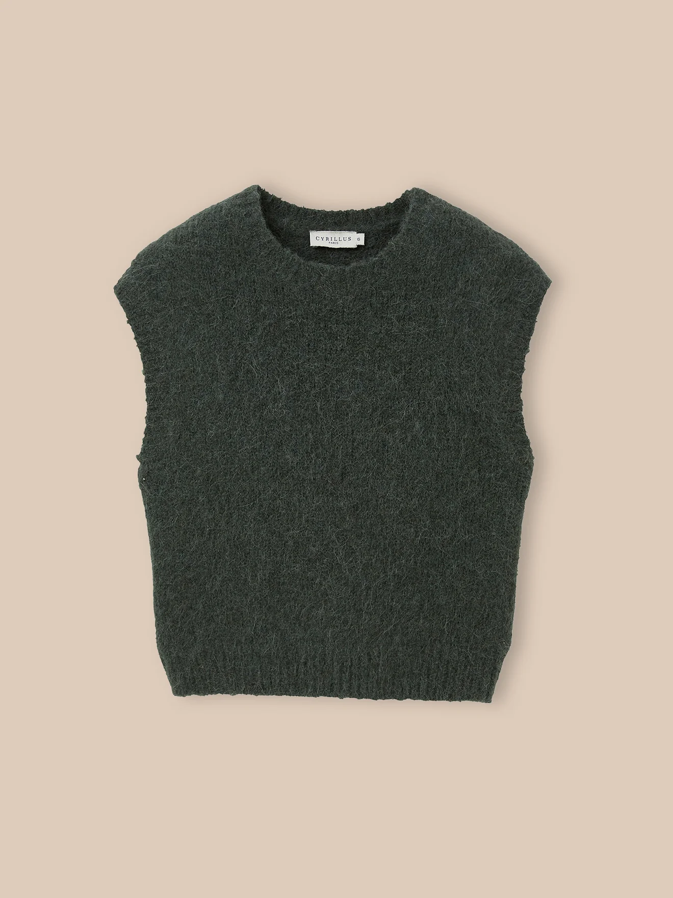 Retour du pull sans manches dans une version plus actuelle : coupe oversize, épaules descendues et tricot mousseux. Finition par bord-côtes