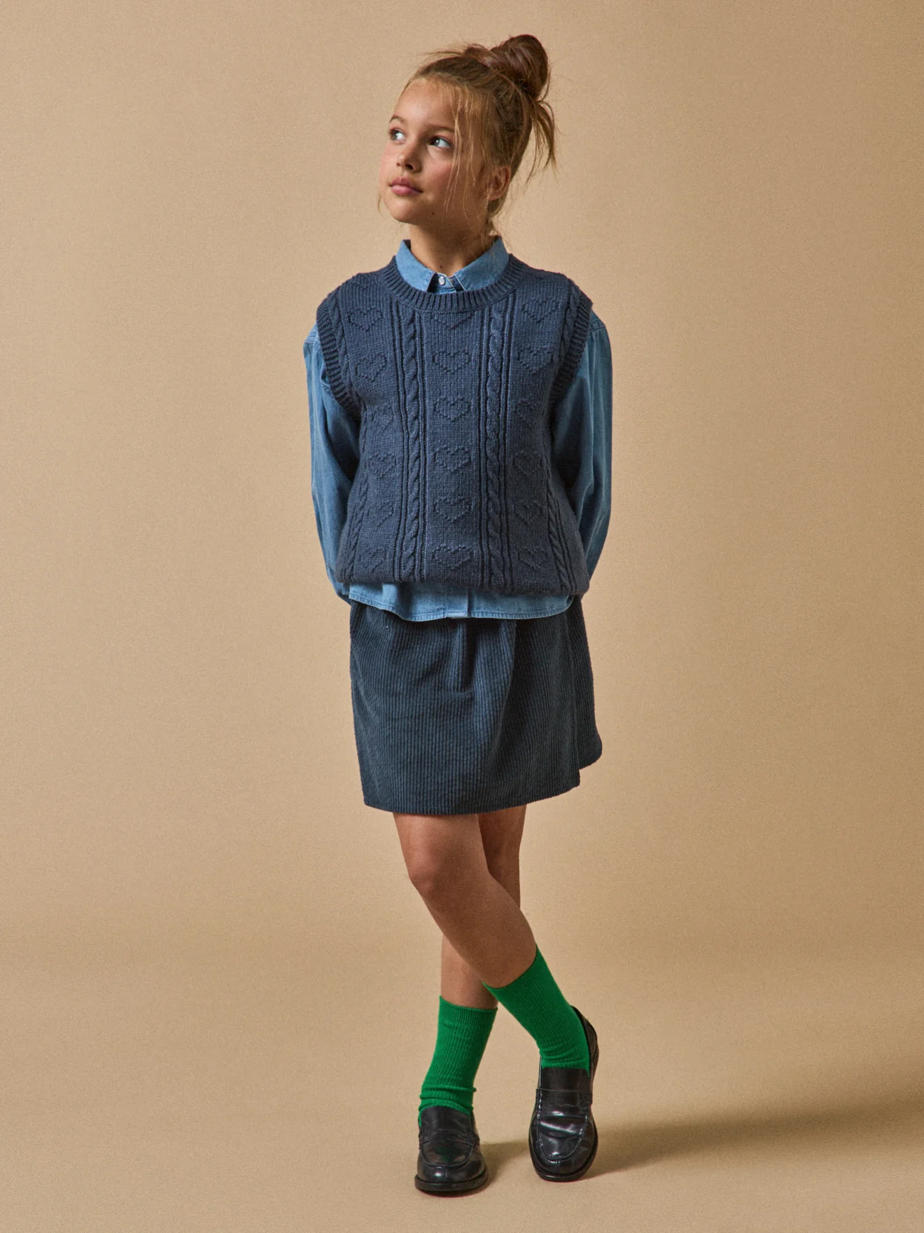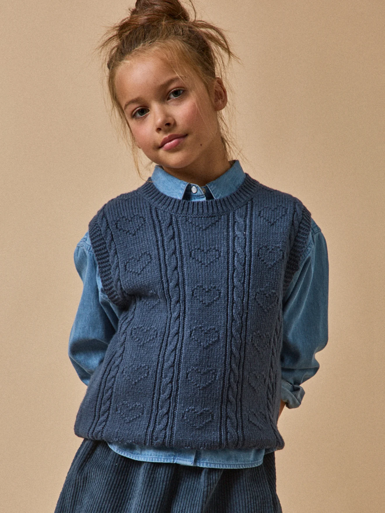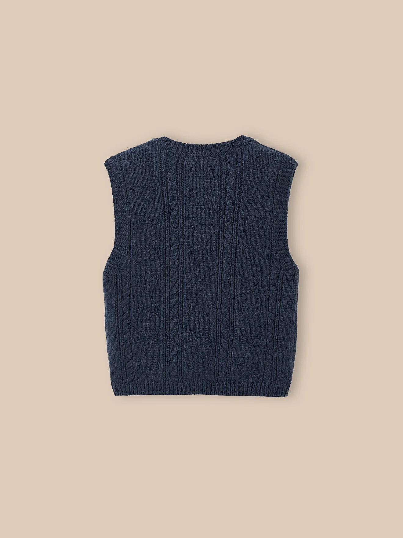 Pull sans manches composé à 40% de laine. Un atout charme à enfiler sur une blouse ou une chemise. Jeux de torsades et motifs coeur