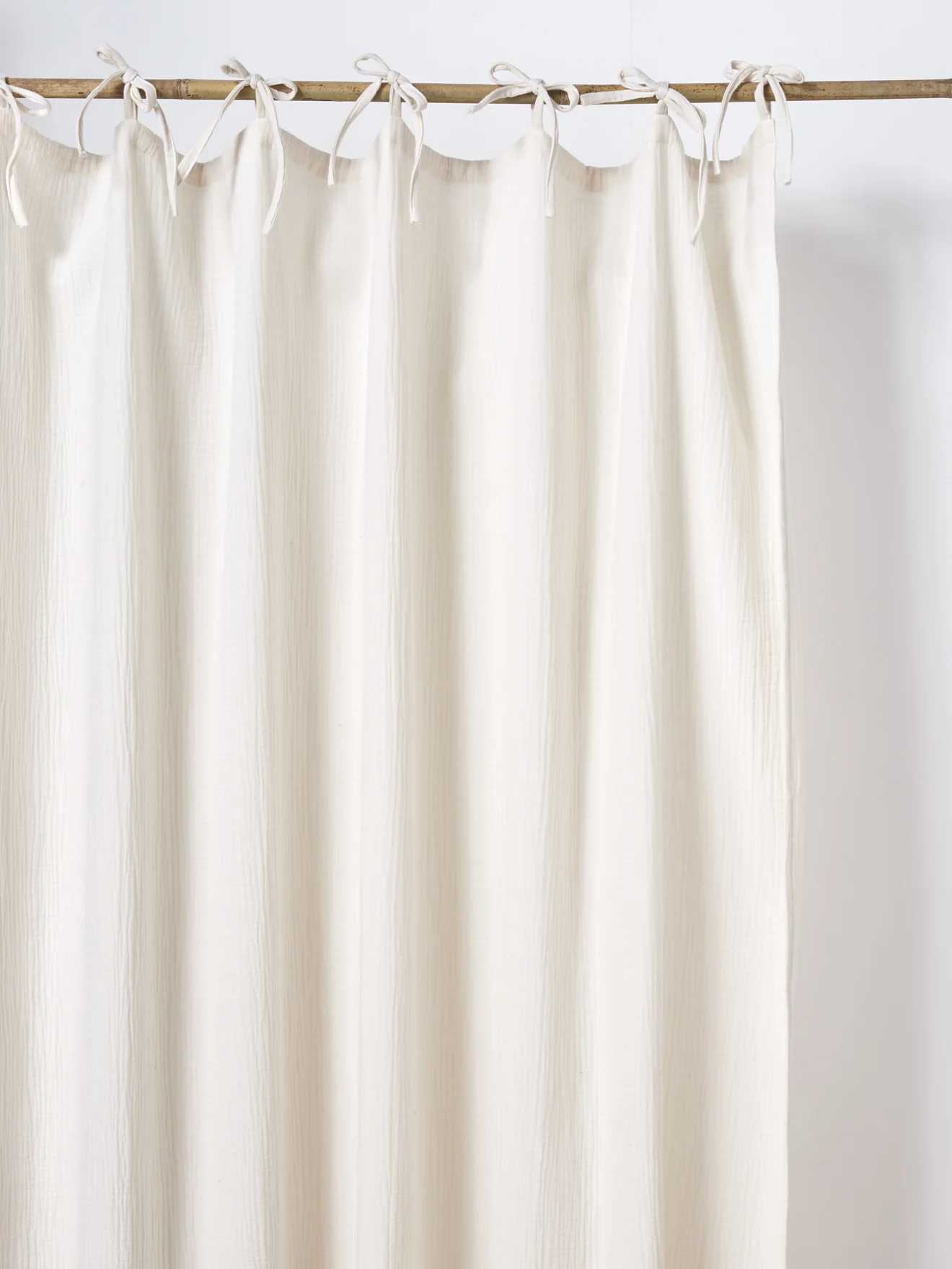 Rideau à l’aspect gaufré confectionné en gaze de coton et maintenu par de petites nouettes. Liens à nouer. Dim. 140 x 260 cm env. Rideau vendu à l’unité.
