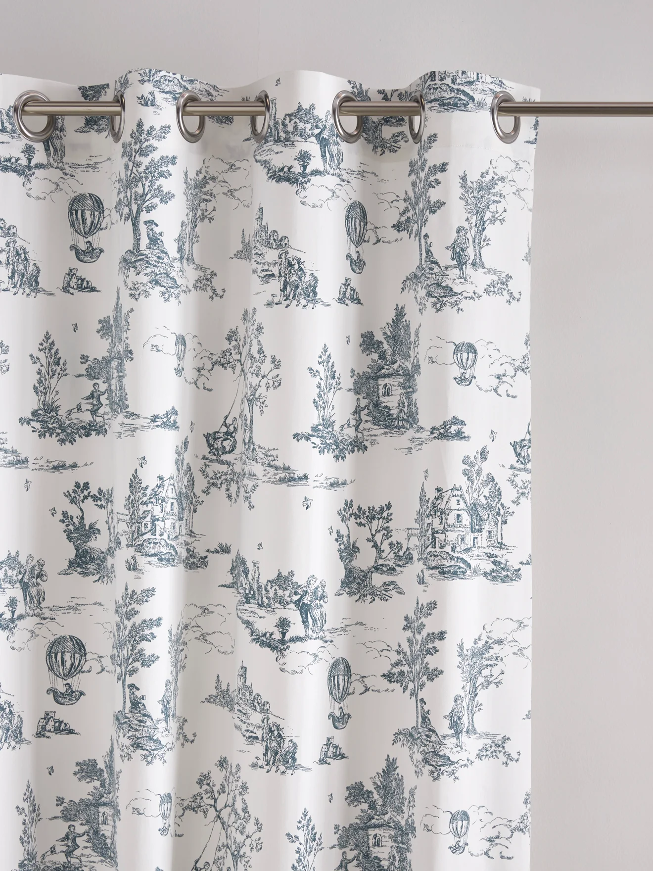 Nous avons choisi de nous inspirer de l’esprit toile de Jouy pour réaliser ce rideau à oeillets en coton épais. Un style quasi authentique au charme chic et intemporel. Motifs gris bleuté. Oeillets en métal coloris argenté.