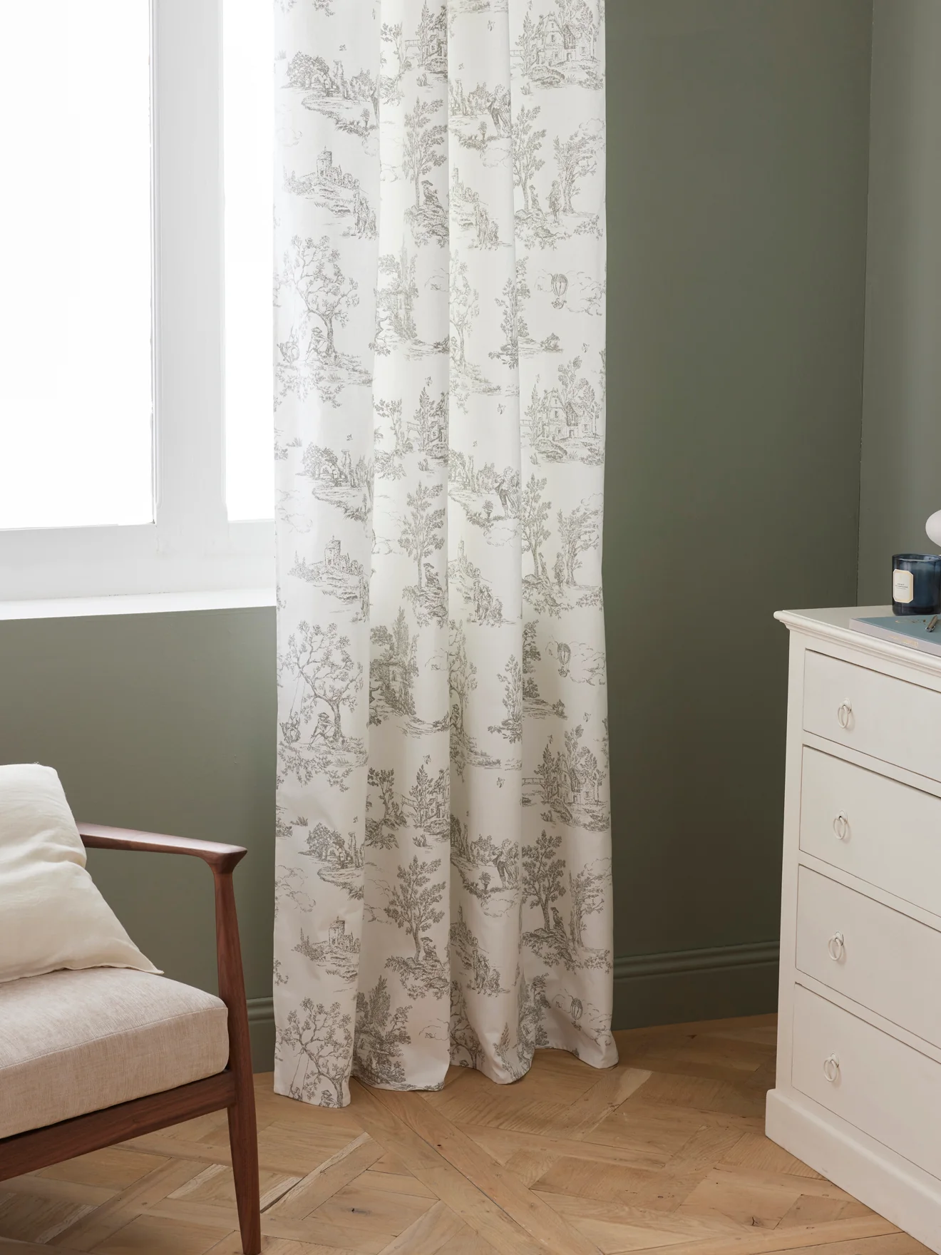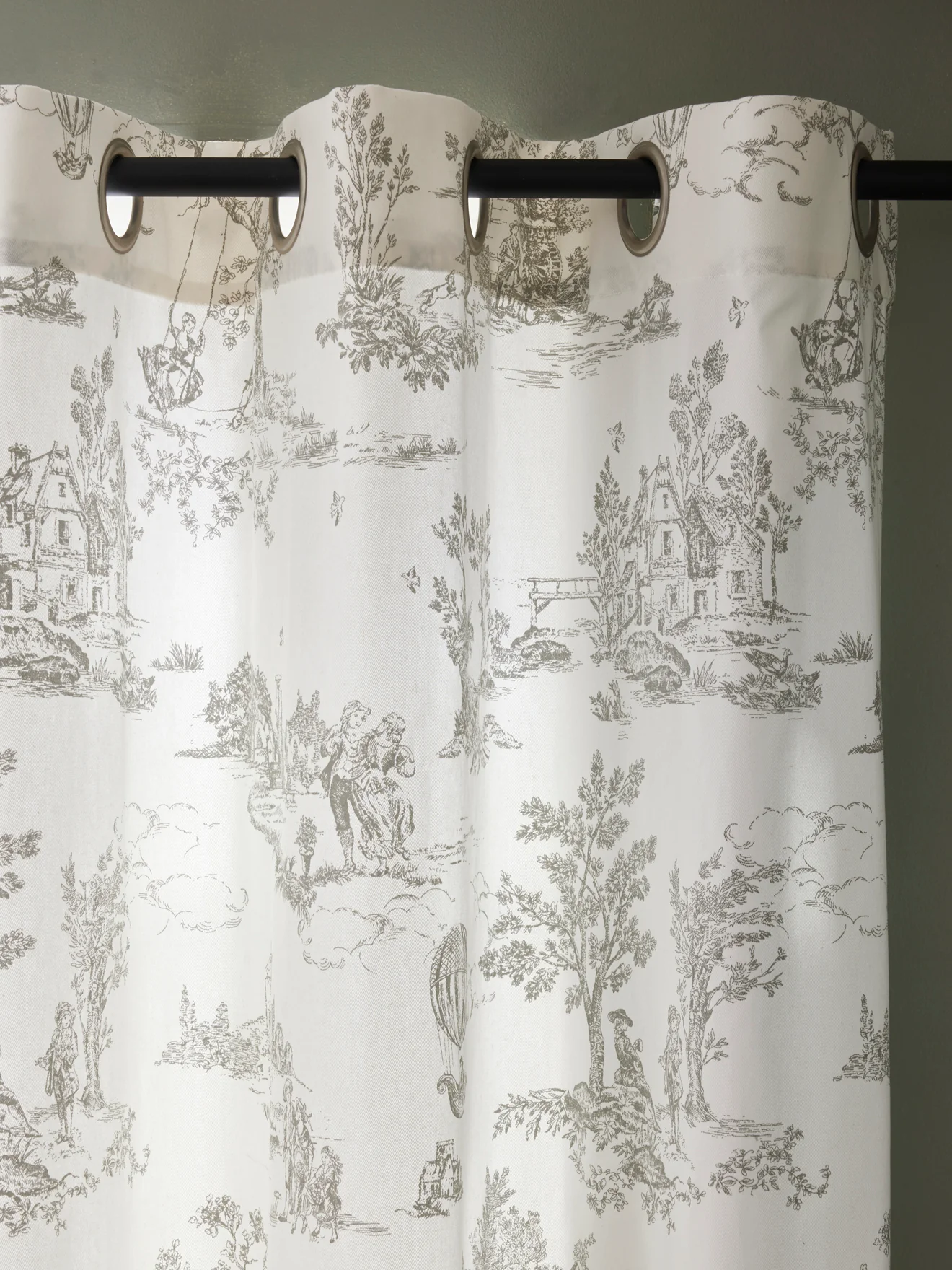 Nous avons choisi de nous inspirer de l’esprit toile de Jouy pour réaliser ce rideau à oeillets en coton épais. Un style quasi authentique au charme chic et intemporel.