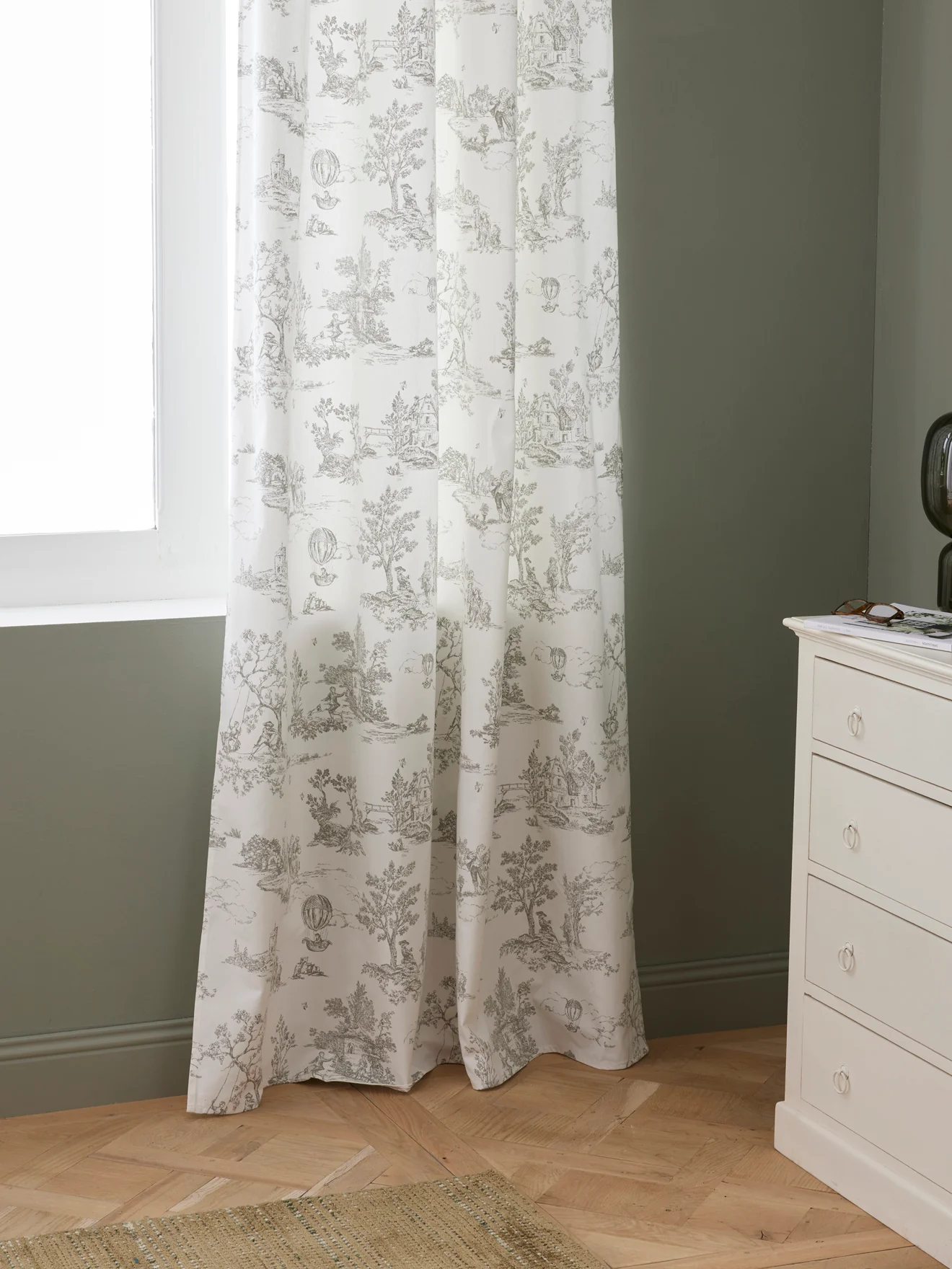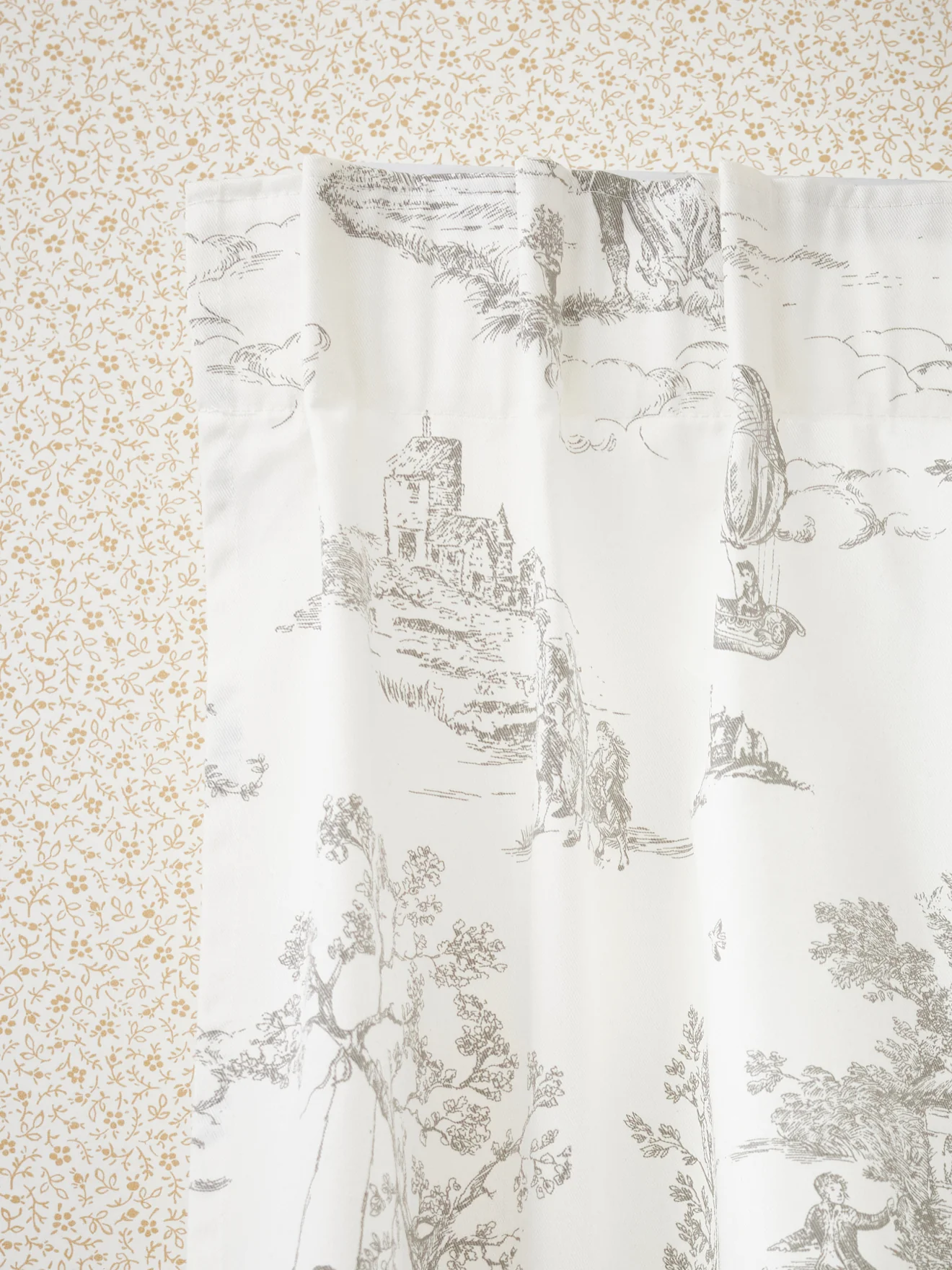 Nous avons choisi de nous inspirer de l’esprit toile de Jouy pour réaliser ce rideau à bande ruflettes en coton épais. Un style presque authentique au charme chic et intemporel.