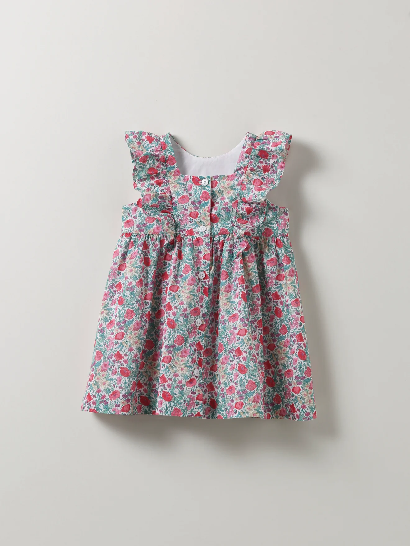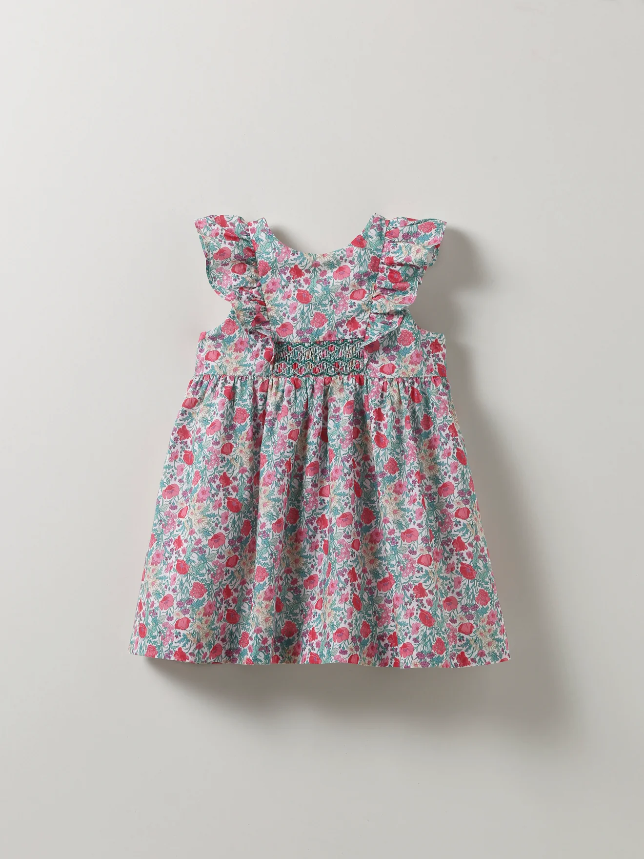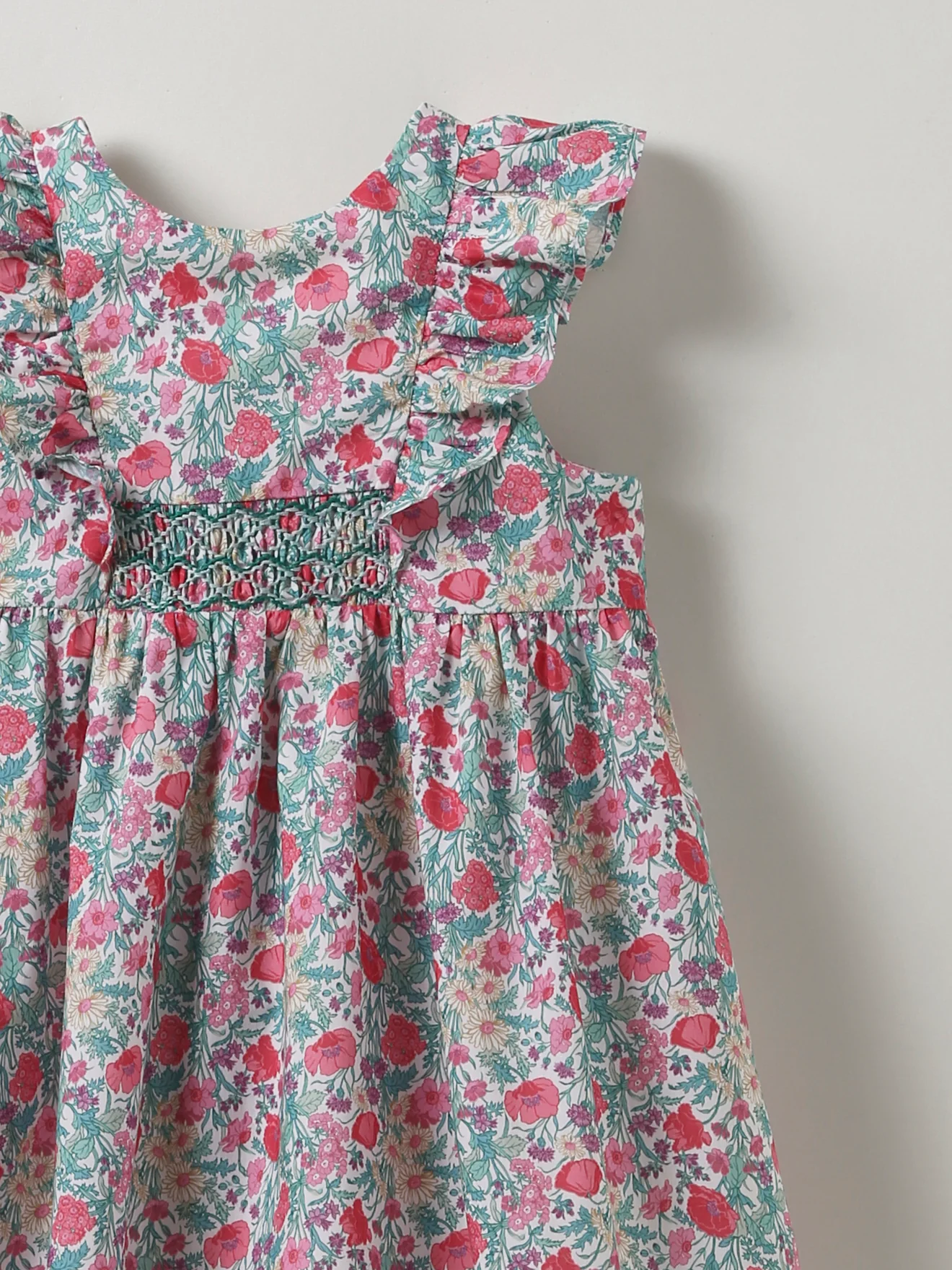 Sur un tissu Liberty se posent des smocks brodés réalisés à la main. Une robe raffinée confectionnée avec le plus grand soin par nos partenaires de Madagascar. Smocks brodés réalisés à la main Volants devant et dos Ouverture totale au dos par boutons
