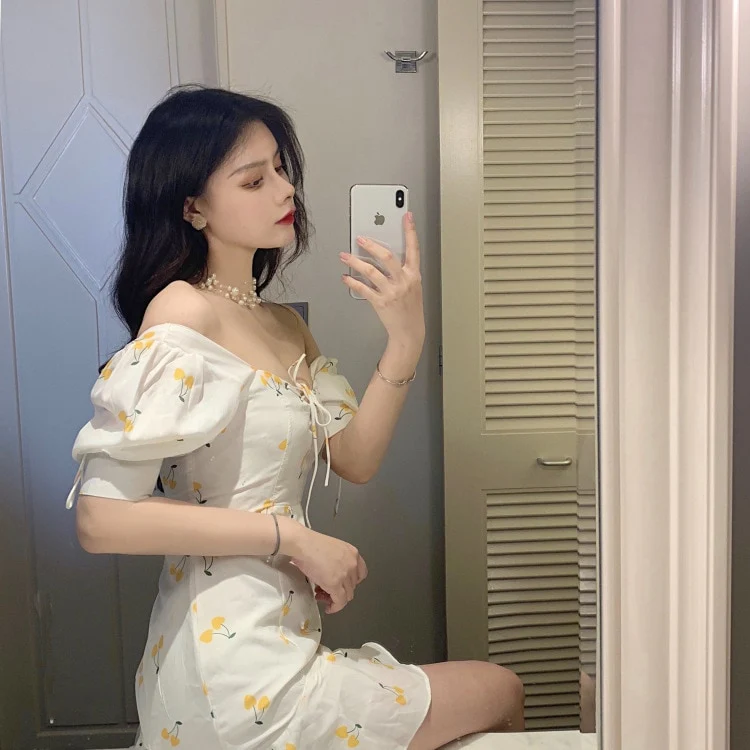 Cette petite robe blanche est décorée avec des cerises jaunes. Profitez du style léger et estival de cette petite tenue pour sortir danser au vent comme les Blackpink.