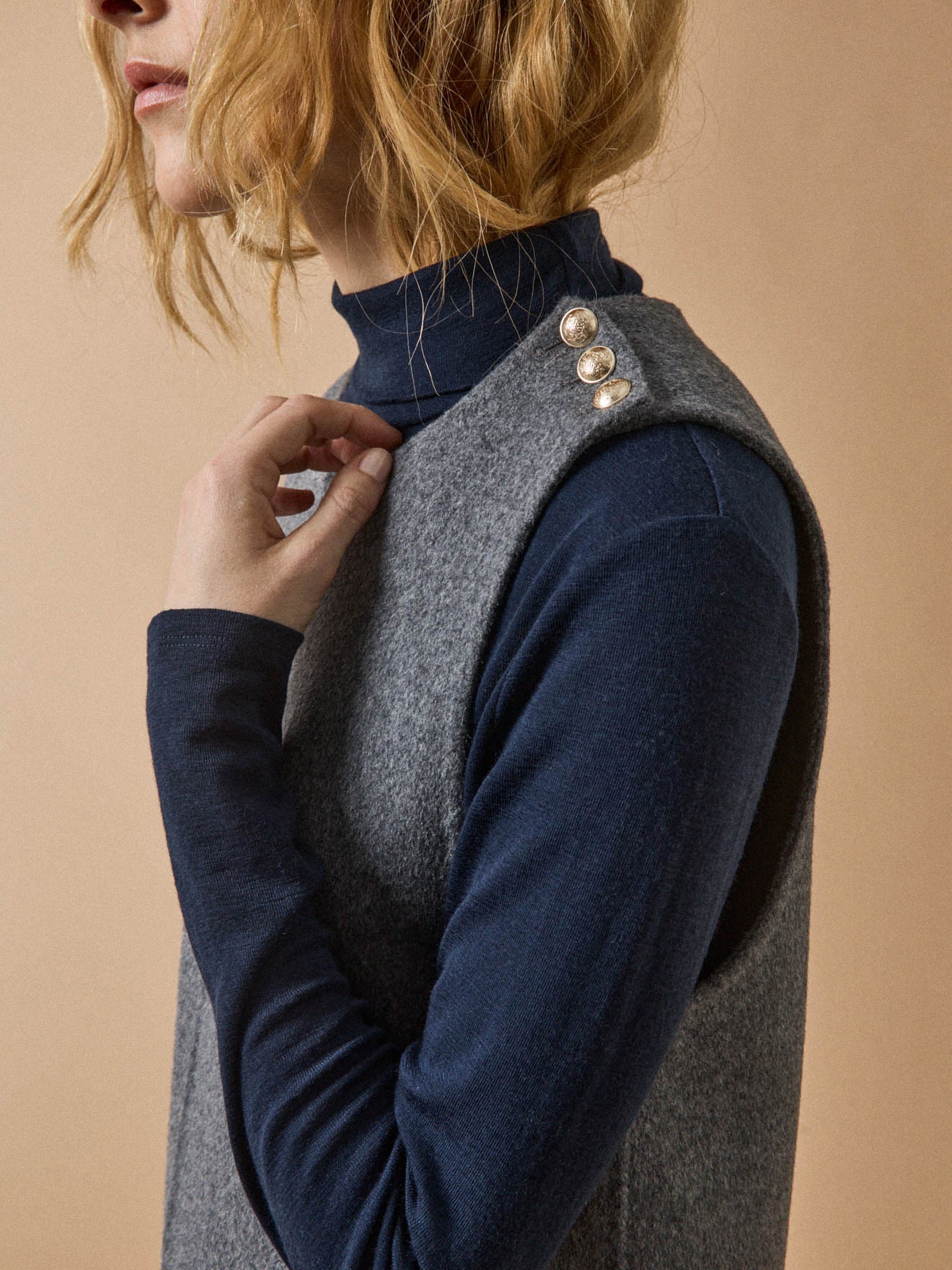 D’inspiration vintage, la robe ressuscite un grand classique des années 60 : la coupe façon chasuble. Sur un lainage double face chic et chaleureux, avec le volume, la longueur et l’allure d’aujourd’hui. Ligne sans manches, col rond, patte boutonnée sur 1 épaule ; découpe surpiquée devant/dos Fausses poches passepoilées et boutonnées devant ; long. milieu […]