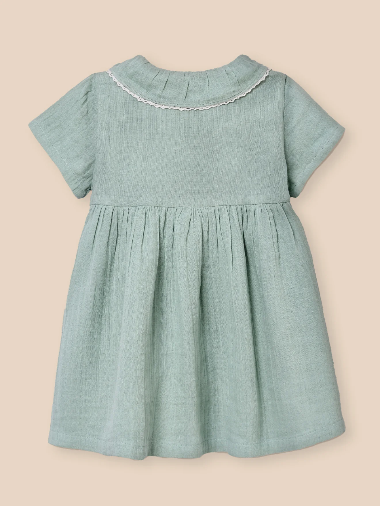 Robe d’été en gaze de coton, confortable et chic, avec un col volanté souligné d’un croquet.
