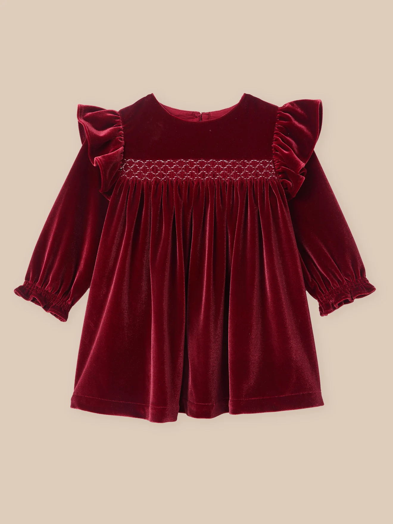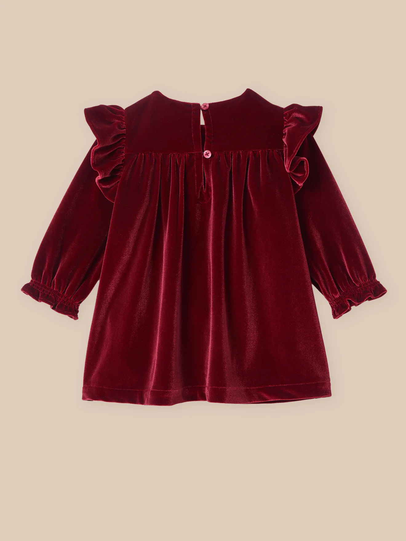 Panne de velours rouge profond et détails raffinés, cette robe incarne l’élégance des jours de fête. Larges volants devant et dos Jeux de smocks. Fronces sous l’empiècement poitrine pour une belle ampleur Poignets élastiqués. Ouverture au dos par boutons