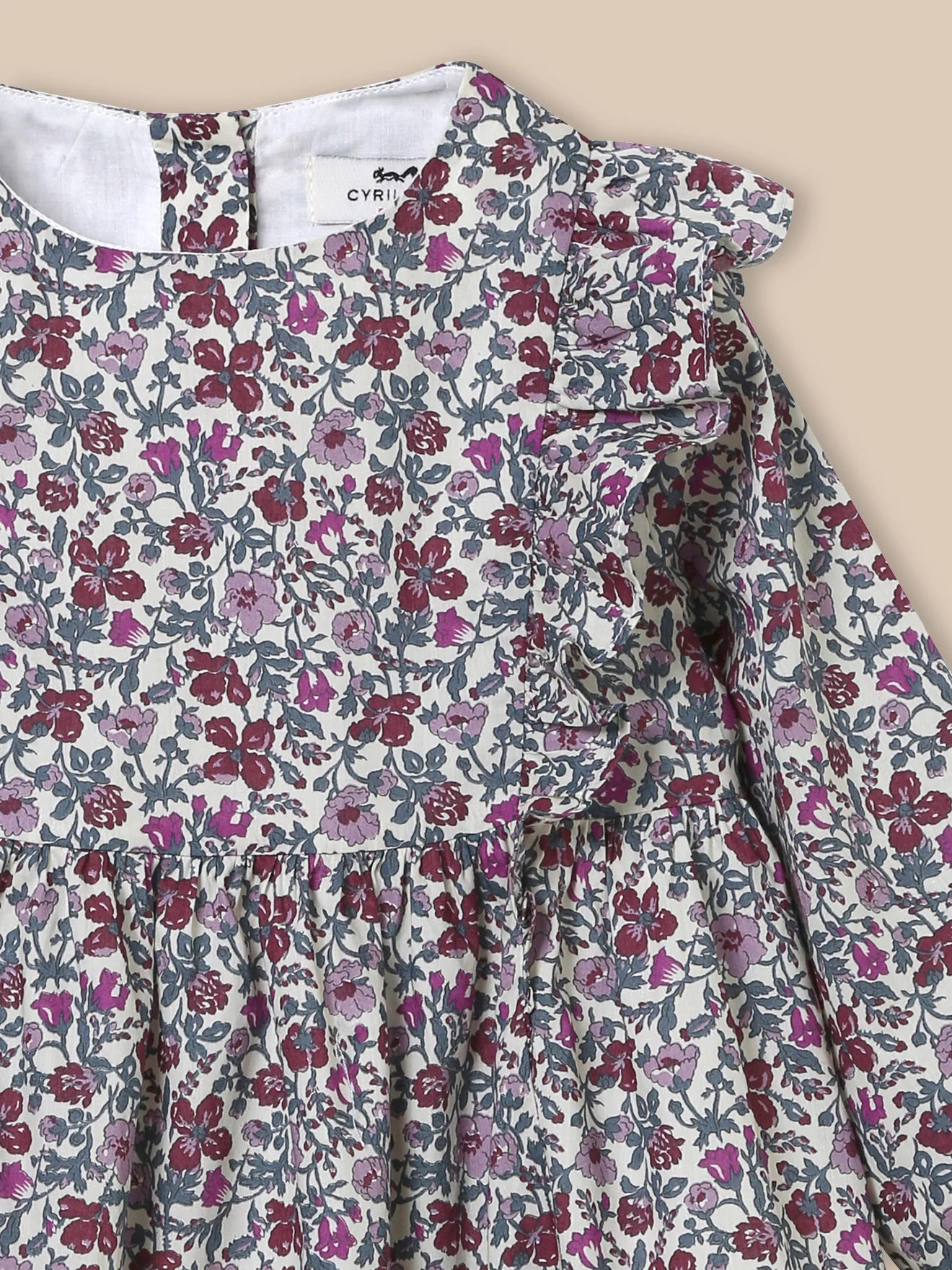 Un motif intense et coloré pour cette robe en tissu Liberty. Son volant délicat apporte une touche de légèreté à ce modèle plein de caractère. Volants devant et dos Fronces sous la découpe taille Poignets élastiqués. Ouverture au dos par boutons