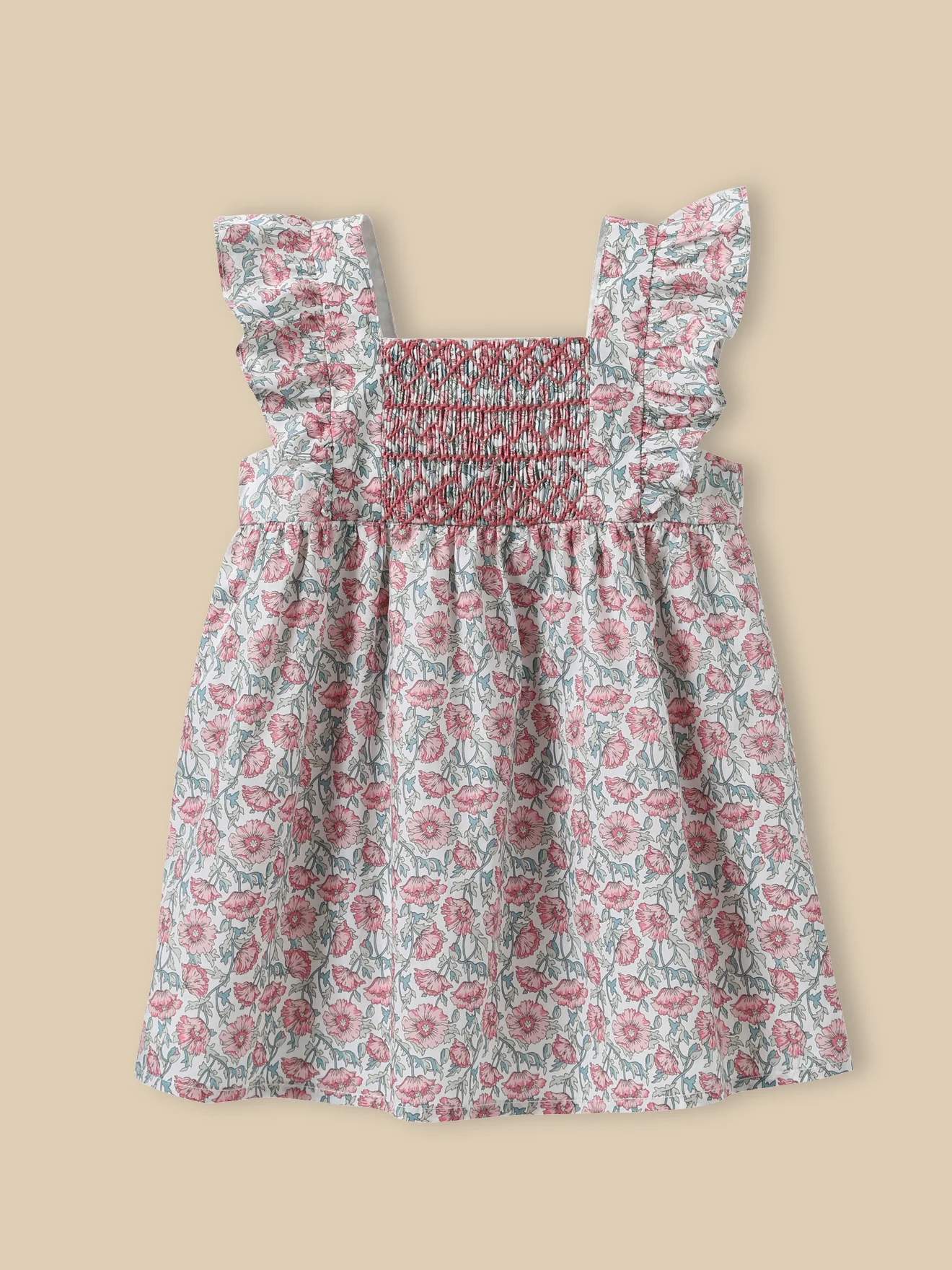 Sur un tissu Liberty Astell Reece se posent des smocks brodés. Une robe raffinée confectionnée avec le plus grand soin par nos partenaires de Madagascar.