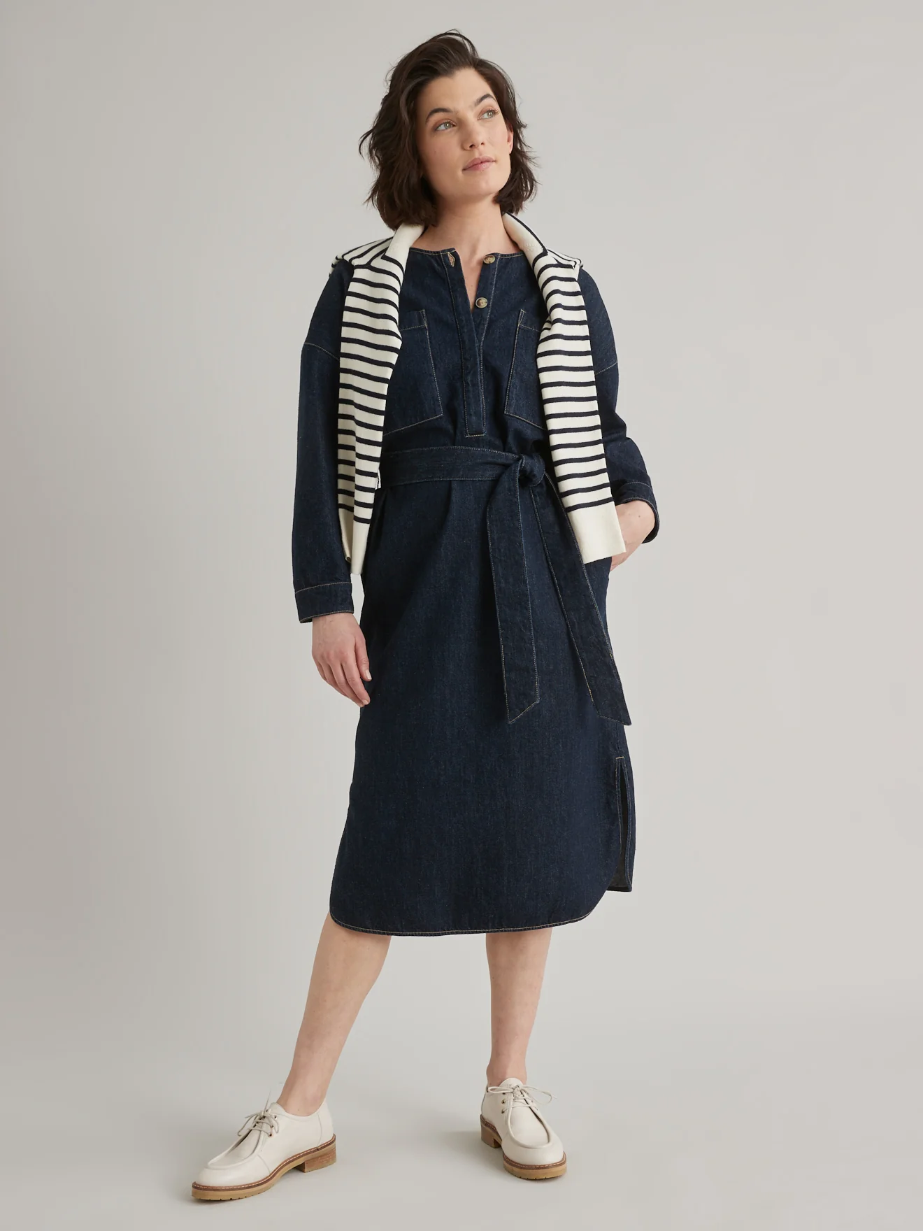 Une façon plus éthique d’appréhender la mode avec un textile 80% coton, 20% chanvre. Aspect brut, toucher doux, résistance : une belle matière naturelle pour une robe confortable, durable et authentique. o Forme housse, emmanchures descendues, patte de boutonnage cachée, 1er bouton apparento Poches coutures côtés, ceinture amovible même matière à nouer sous passantso Base […]
