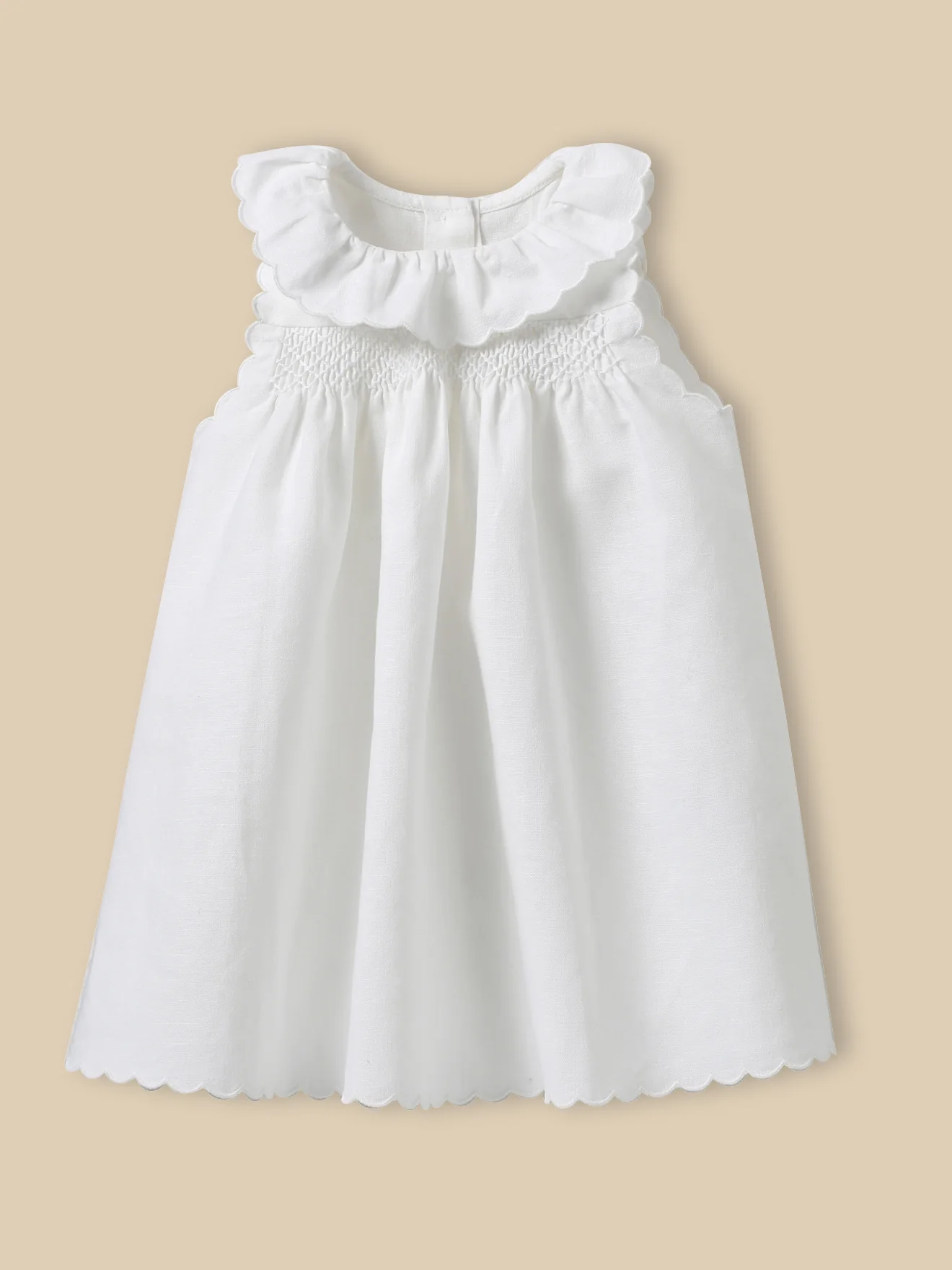 Une robe d’exception pour les grands événements familiaux. Confectionnée avec soins : collerette volantée, smocks brodés, volume ample et bloomer assorti… Une création intemporelle à transmettre. Finition par picot Smocks brodés à la main Ouverture totale au dos par boutons Taille et cuisses élastiquées