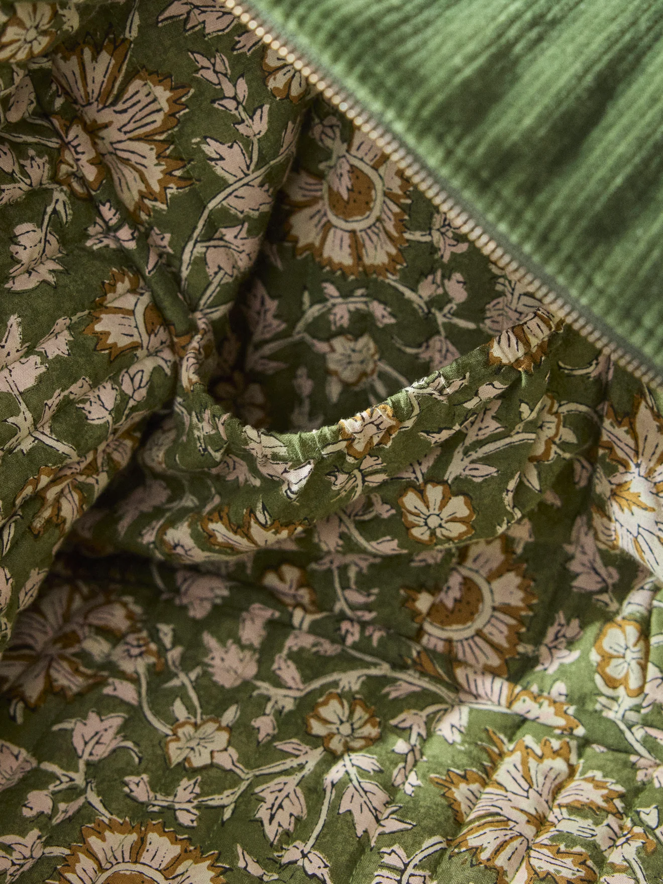 Sac matelassé confectionné en velours côtelé. Doublure en authentique tissu fleuri indien. Piqûres verticales pour un effet matelassé. Fermeture zippée en métal avec double curseur pour une ouverture plus facile. 2 poches intérieures plaquées et élastiquées. 2 anses pour un porté épaule. Idéal pour le shopping, le sport, les virées en week-end…