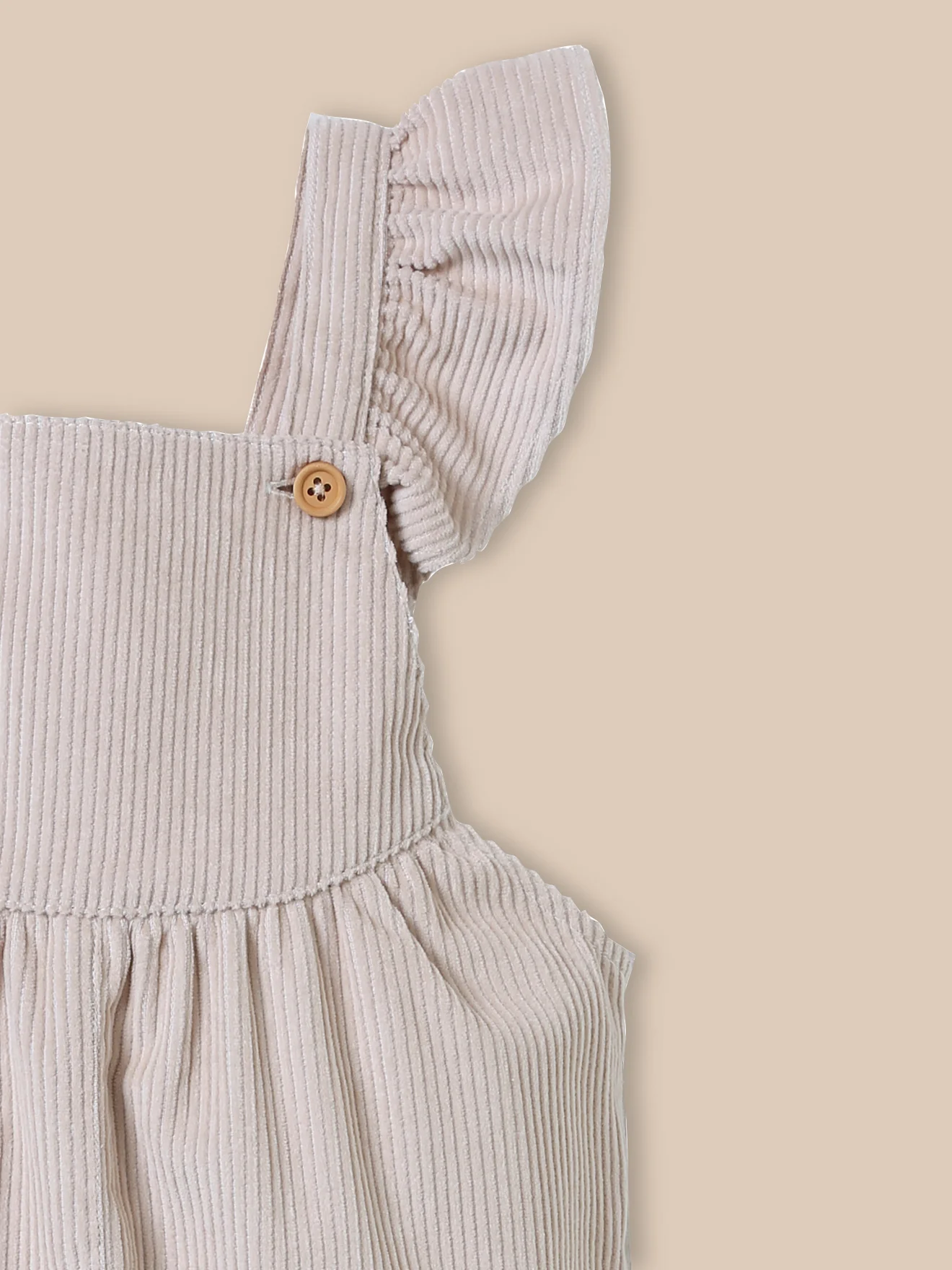 Esprit casual pour cette salopette en gros velours, twistée par de larges volants. Larges volants aux bretelles réglables, boutons en bois Fronces sous la découpes poitrine Pressions cachées à l’entrejambe