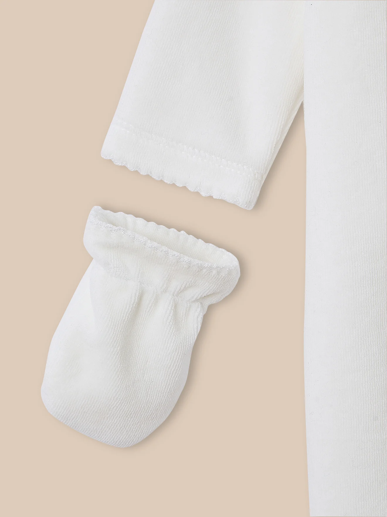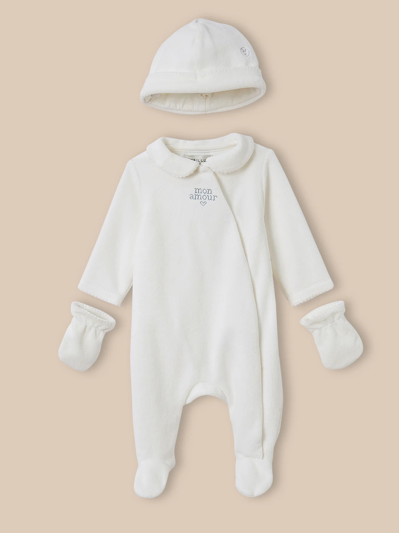 Le set spécial maternité : un dors-bien en velours tout doux, des moufles, et son bonnet assorti : le parfait cadeau de naissance !