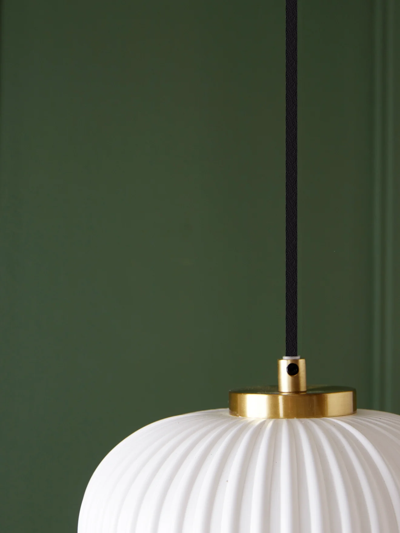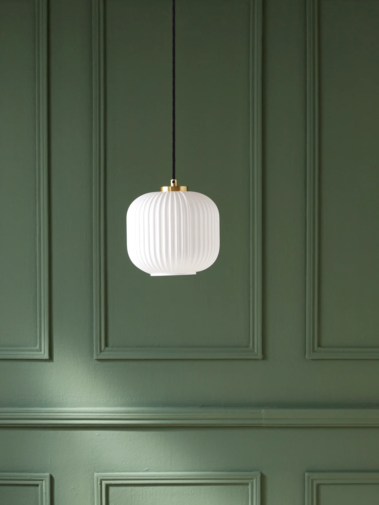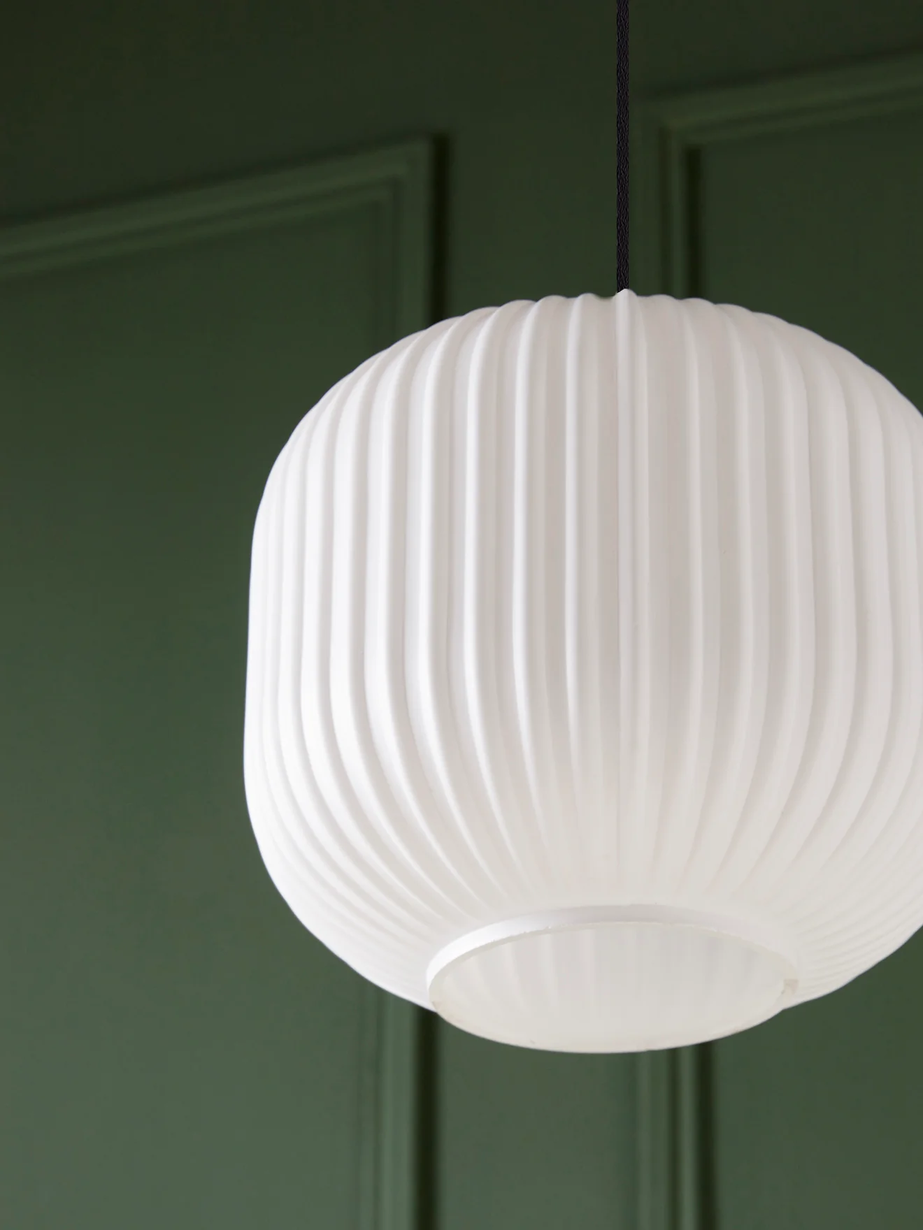 Suspension globe en verre blanc effet opaline. Son design épuré se distingue par le jeu de stries chic et graphique.