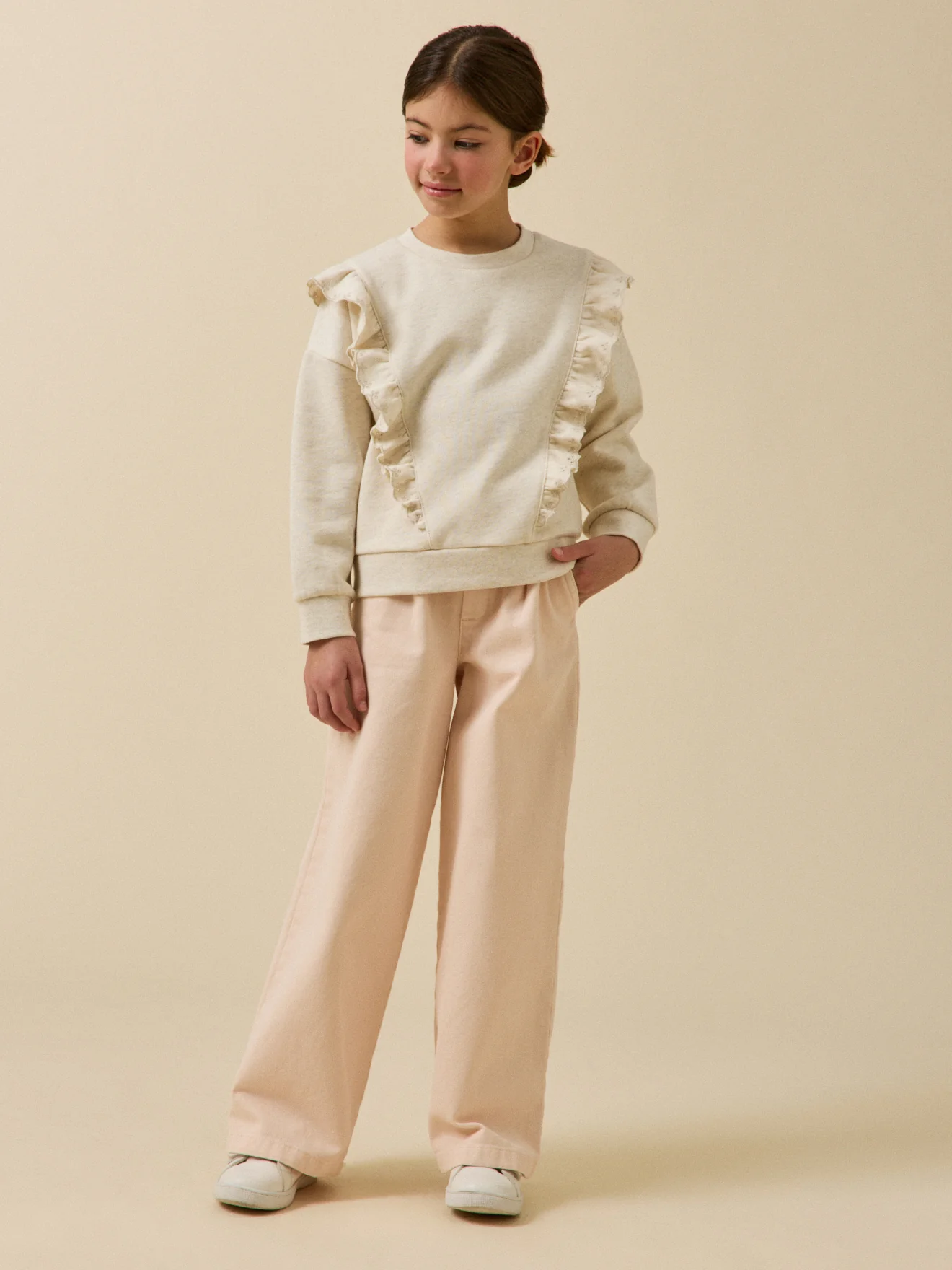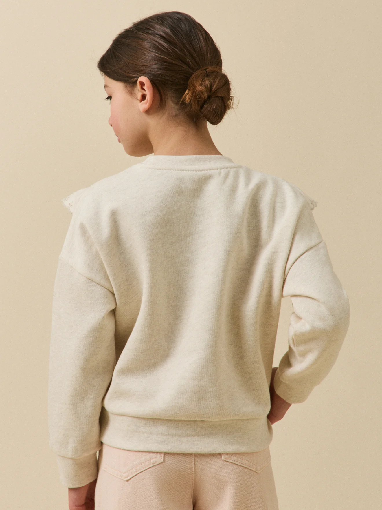 Un sweat réhaussé de volants en broderie anglaise. Le charme discret d’une pièce chic et confortable.