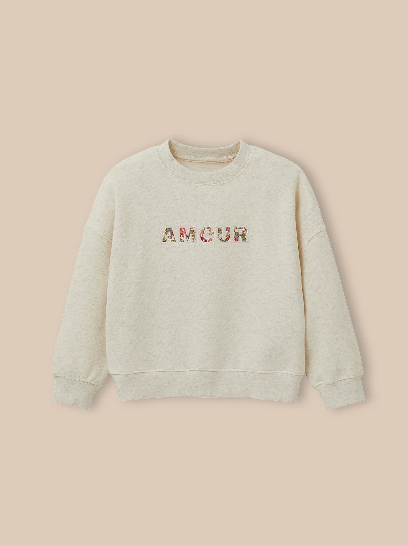 Sweat tout doux au volume légèrement loose avec patchs en tissu Liberty bordés d’un point bourdon.