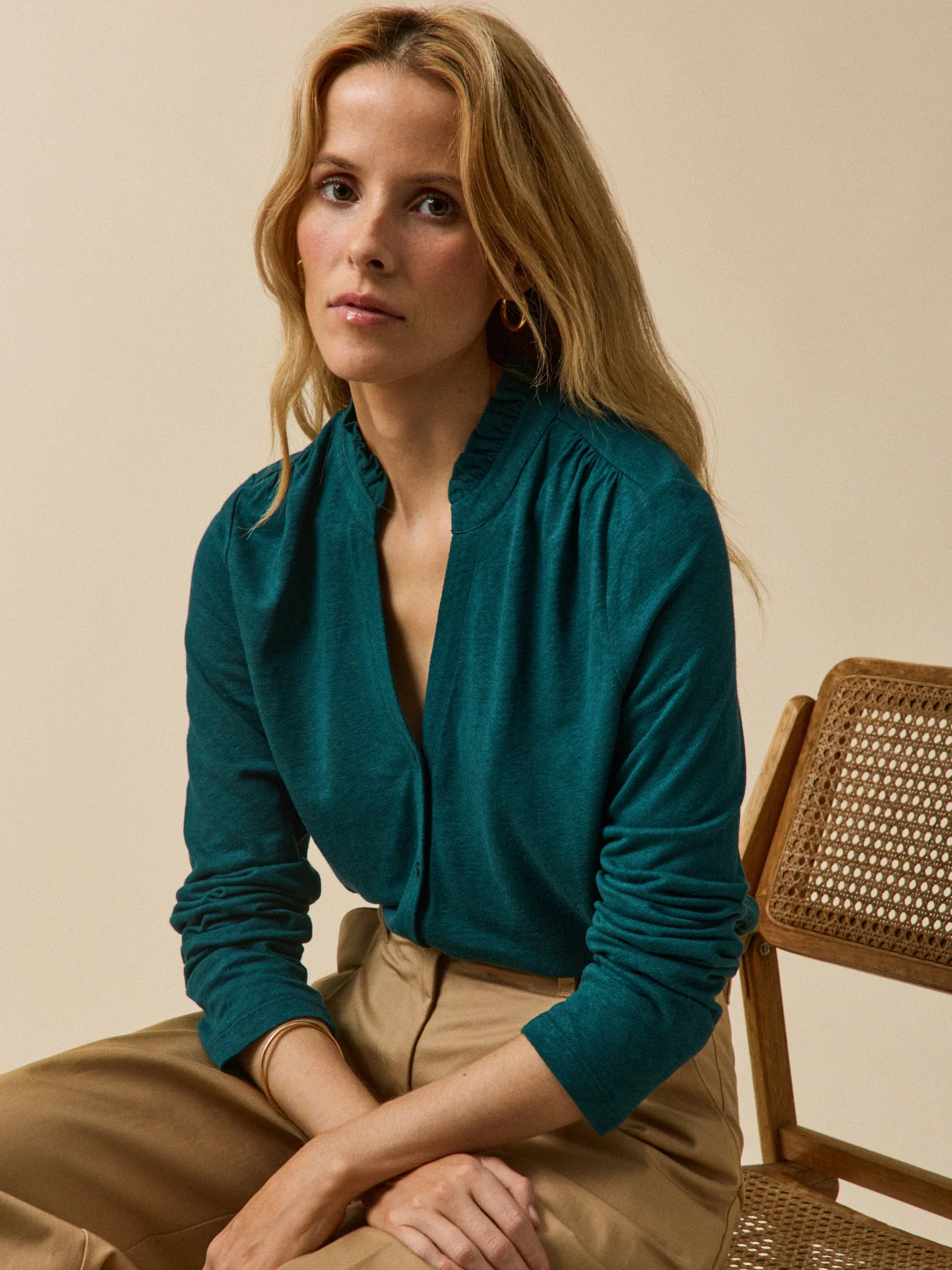 Une matière mélangée qui garde l’allure authentique du lin, avec un tomber plus fluide. Un T-shirt qui joue l’esprit cardi avec une touche volantée pour un quotidien chic et charme.