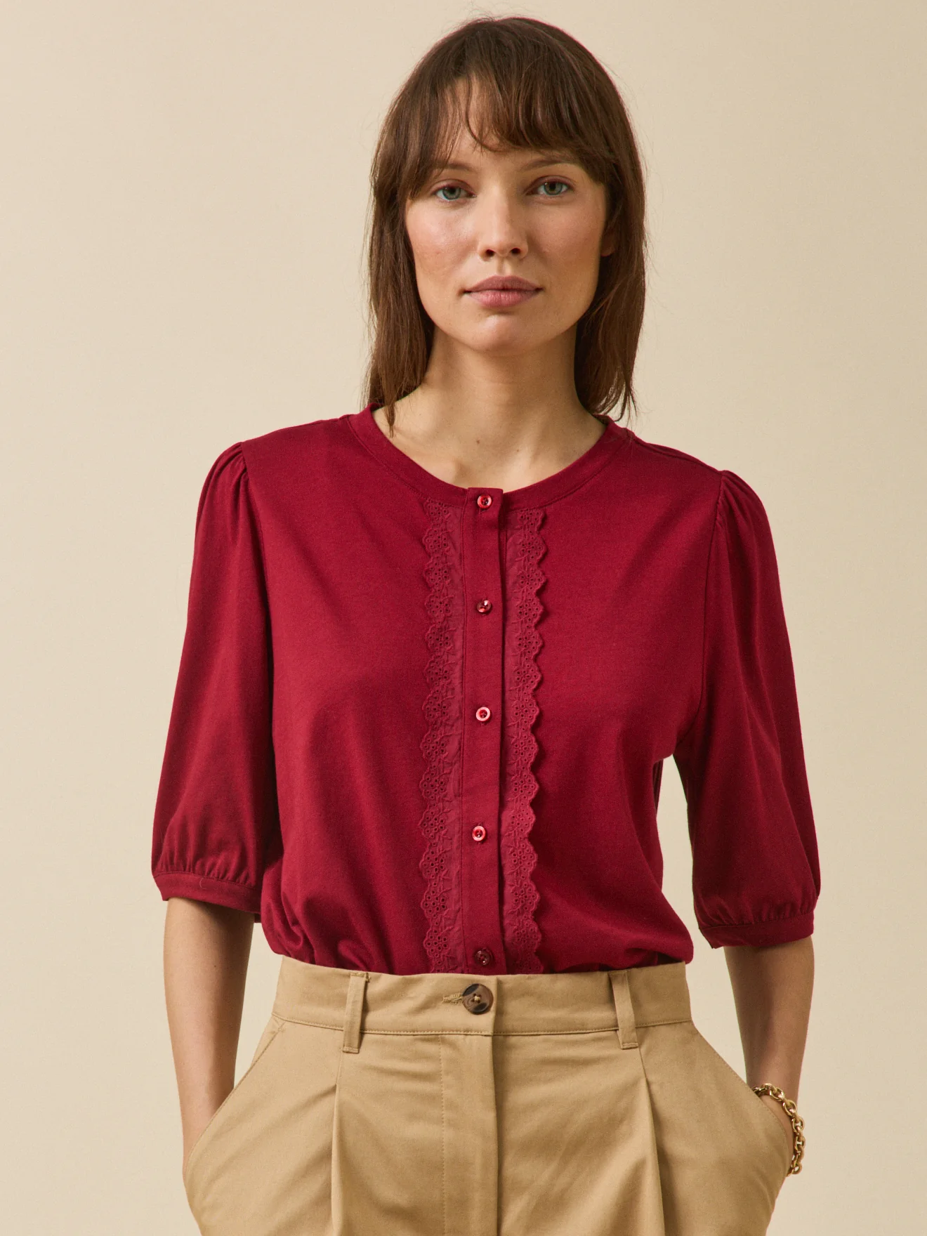 Le nouveau chic, un T-shirt qui emprunte les codes du cardigan. Manches ballon, broderie délicate et belle matière avec coton biologique : c’est une pièce forte en style et en douceur.