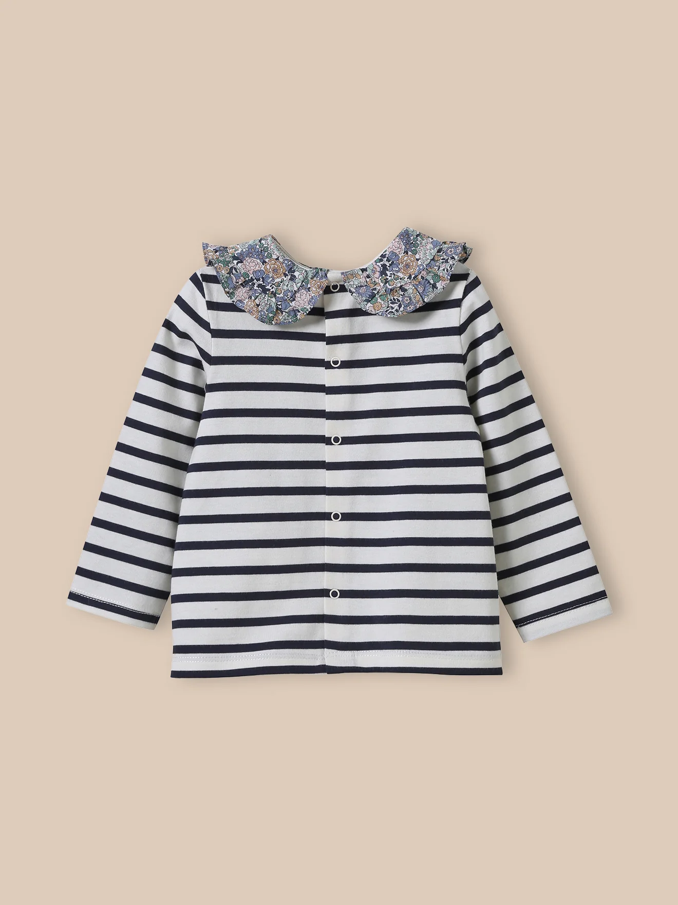 Un tissu Liberty pour le charme, une rayure tonique pour la modernité, le bon duo pour habiller bébé avec élégance. Collerette en tissu ANNIE & MAY Ouverture totale au dos par pressions