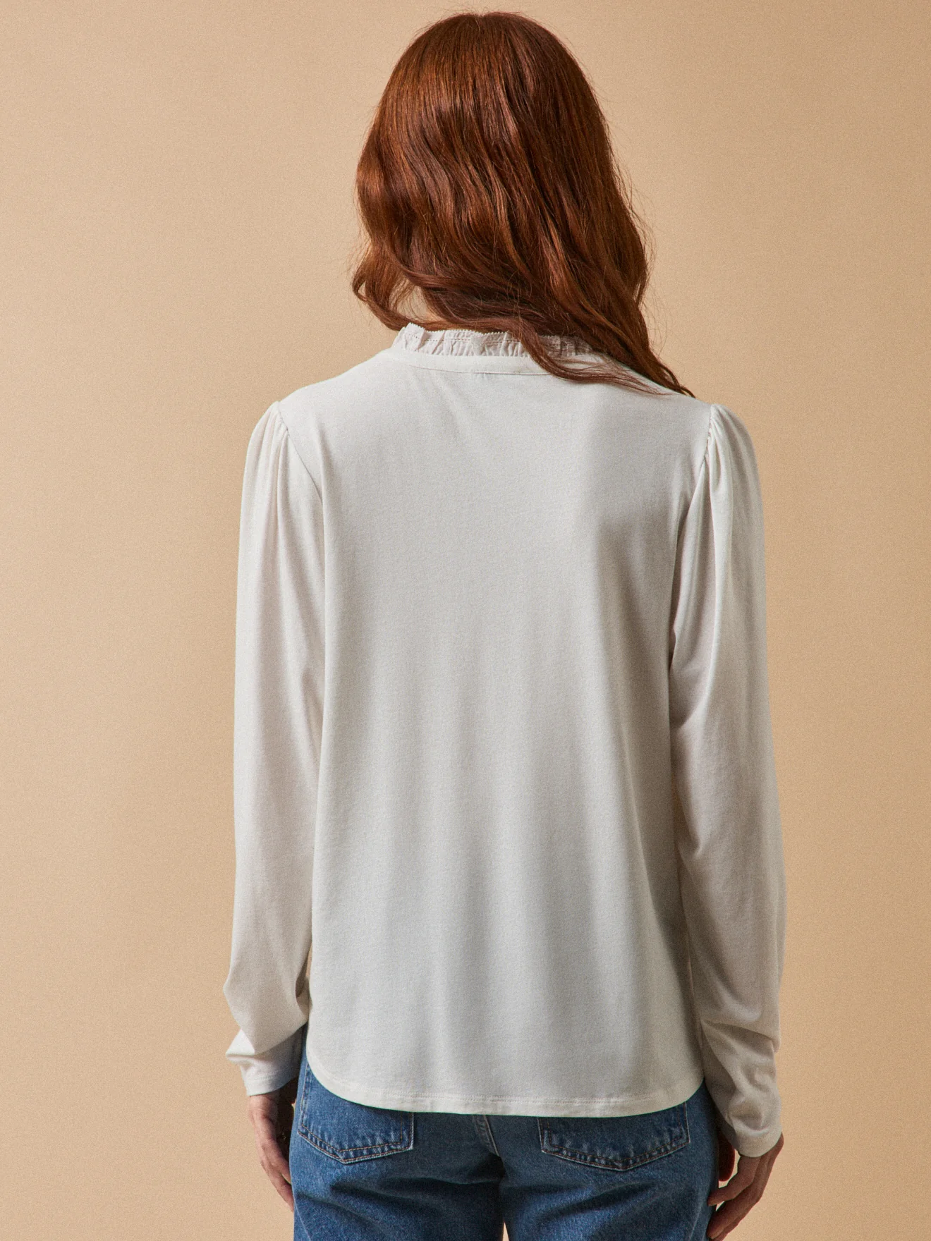 Un joli côté romantique, une belle matière avec coton biologique… le T-shirt a l’art et la manière de se démarquer. Encolure ronde volantée, patte de boutonnage, jeux de plis nervurés formant plastron Manches longues, têtes froncées Base légèrement arrondie ; long. dos 60 cm (en taille S)