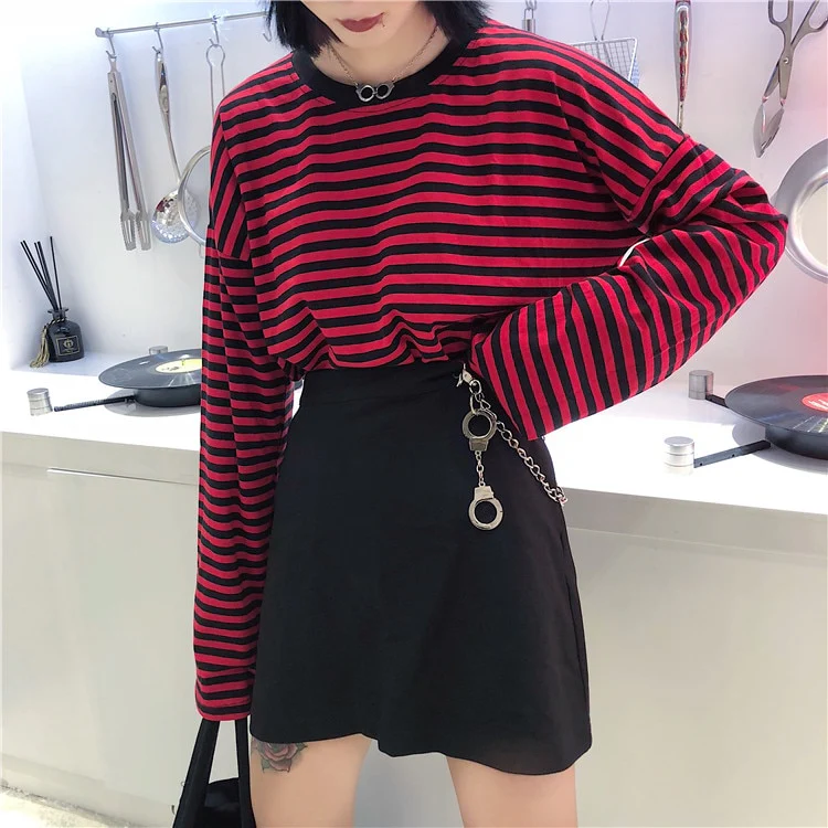 Ce T-Shirt à manches longues est disponible en deux coloris : rayé blanc et noir et rayé noir et rouge pour un style plus rock. Il se porte de manière un peu ample et non près du corps. La particularité de ce modèle striped est que ses manches sont très (Très) longues (elles dépassent les mains). Il est facilement accessoirisable et se porte avec un bas (jupe ou pantalon) uni.