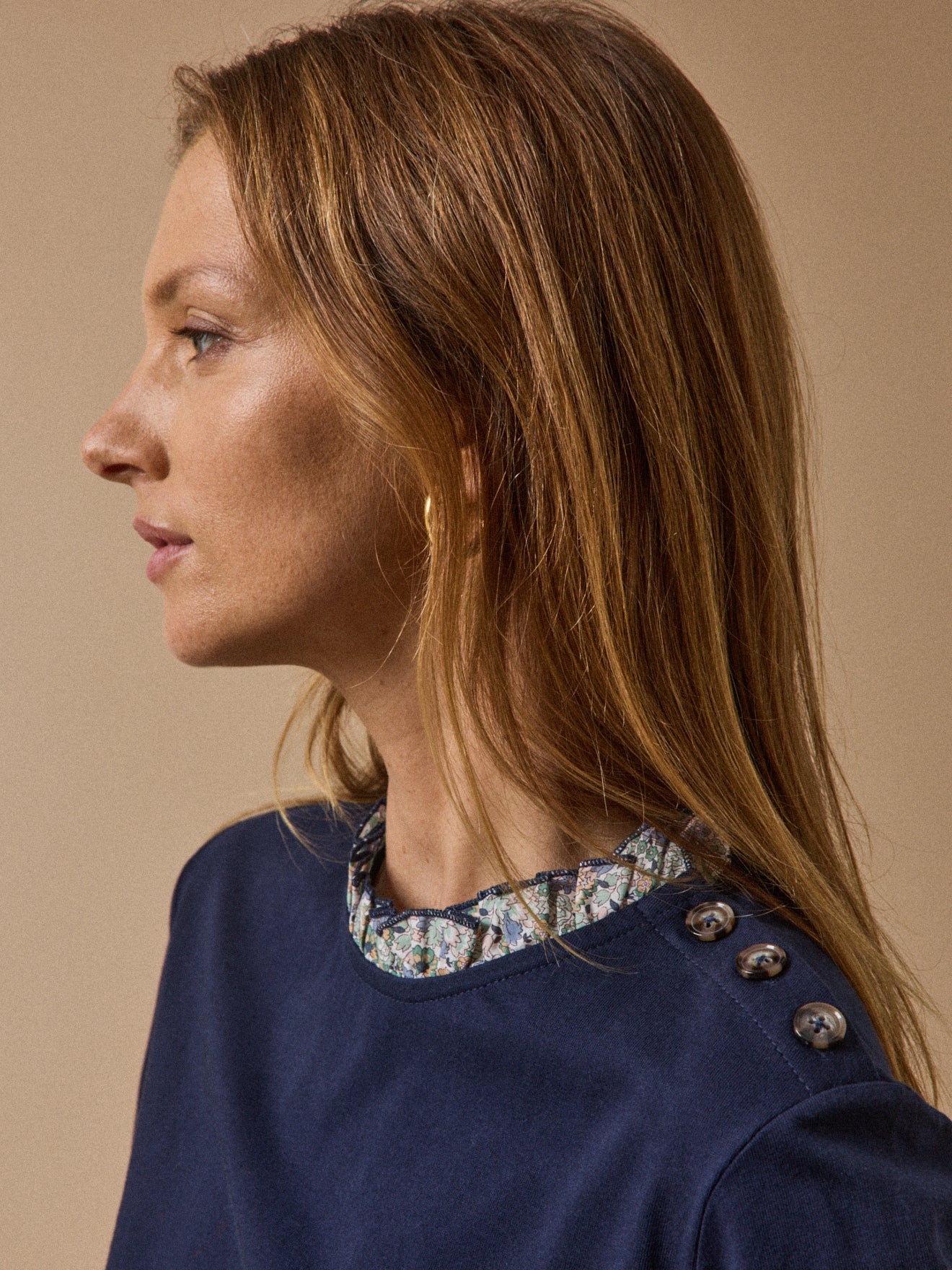 - Col rond rehaussé d’une finition volantée en tissu Liberty, patte boutonnée sur une épaule