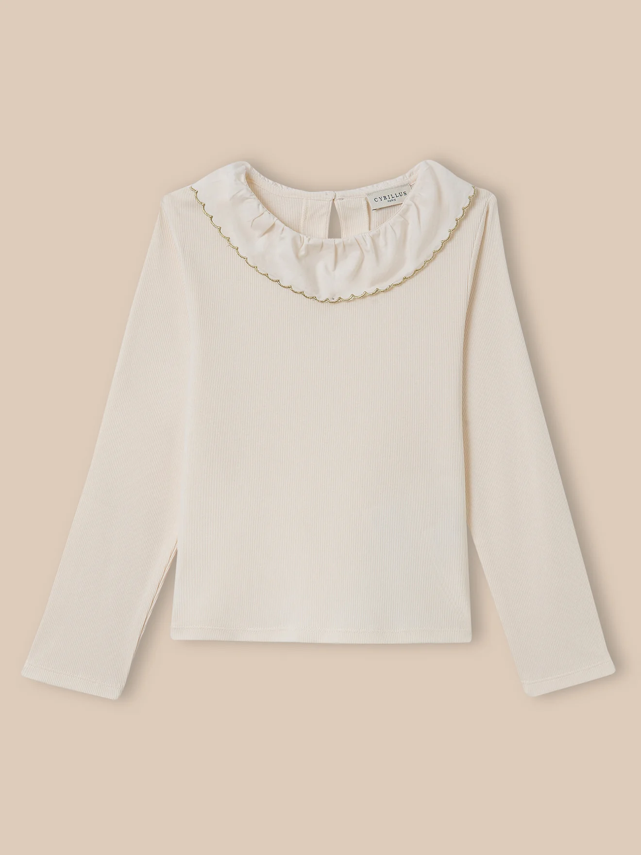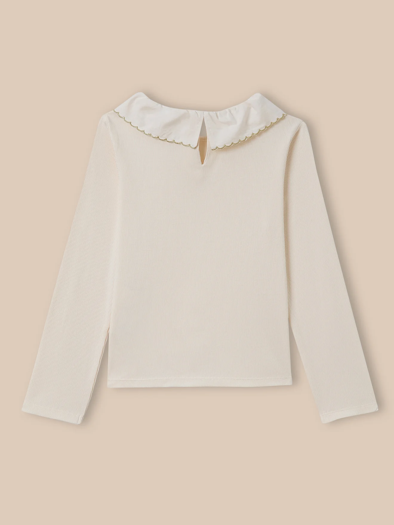 Parfait pour les fêtes, ce t-shirt se distingue par son col festonné en voile, délicatement souligné d’une broderie dorée.